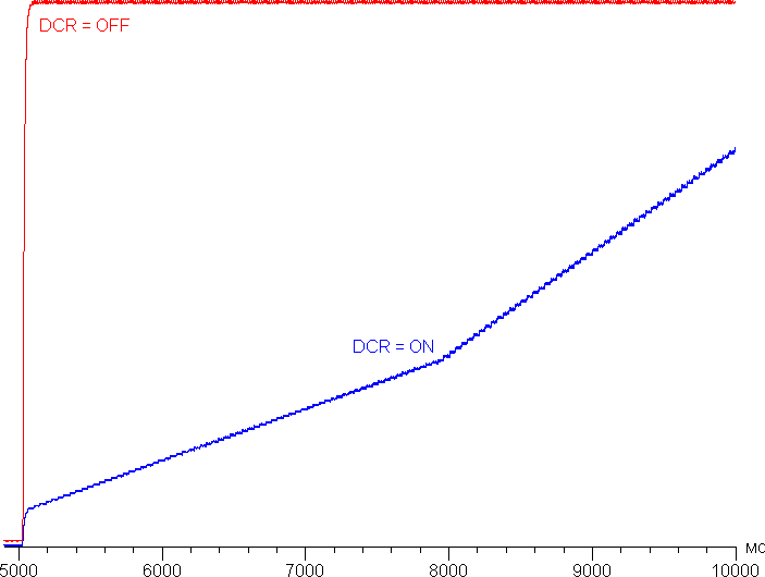При включении режима DCR (по умолчанию выключено) установившаяся контрастность формально возрастает, так как на черном поле во весь экран яркость подсветки сильно уменьшается. В принципе, динамическая подстройка яркости может улучшить восприятие темных сцен, но в данном случае скорость изменения яркости подсветки невысокая, поэтому практической пользы от этой функции немного. График ниже показывает, как увеличивается яркость (вертикальная ось) при переключении с черного поля почти во весь экран (после 5 секунд выдержки) на белое поле тоже почти во весь экран при выключенной и включенной динамической подстройки яркости: