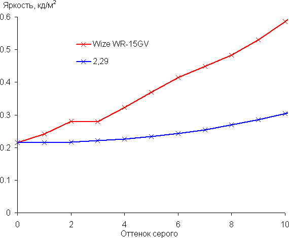 Рост прироста яркости более-менее равномерный, но далеко не каждый следующий оттенок значимо ярче предыдущего. В самой темной области визуально различаются все градации, за исключением пары оттенков, не отличающихся по яркости: