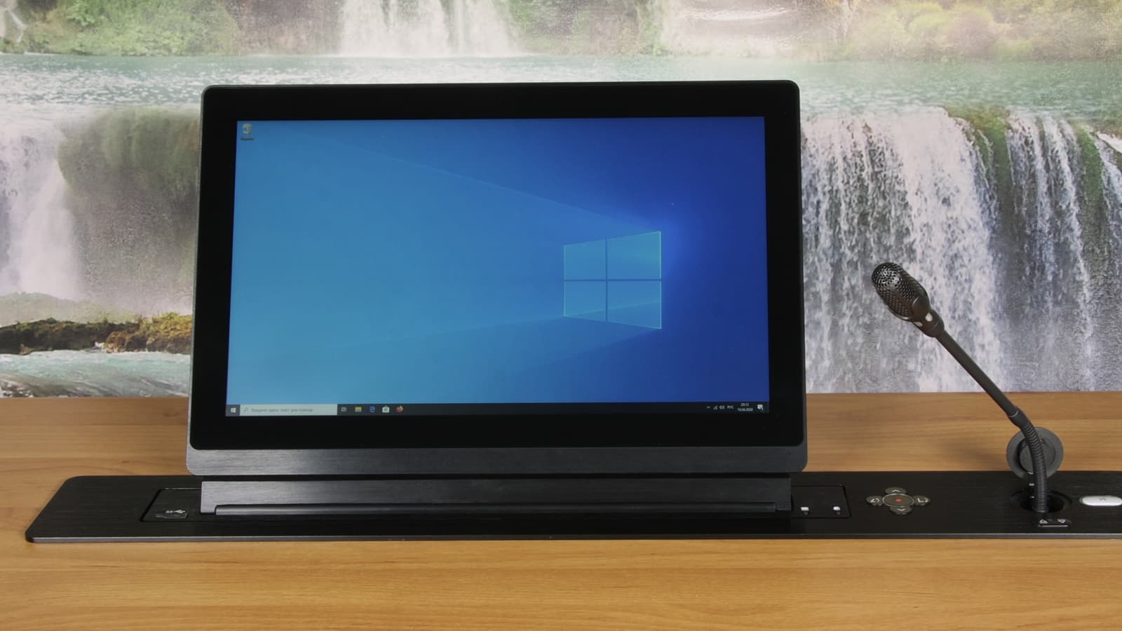 Лифтовая система Wize WR-15GV Touch оснащена выдвижным сенсорным экраном с диагональю 15,6 дюймов и лифтом для микрофона на гибкой стойке. Когда микрофон и монитор убраны, пользователю доступна практически вся площадь стола, так как верхняя панель системы плоская, узкая и выступает всего на 4 мм, а при необходимости панель может быть полностью утоплена в столешницу. Wize WR-15GV Touch отличается строгим дизайном и простотой установки. Она имеет хорошие возможности по удаленному управлению с помощью проводного и беспроводного интерфейсов. Подъем монитора и микрофона достаточно быстрый, что очень удобно. Уровень шума от лифтов монитора и микрофона невысокий, не мешает обсуждению при переговорах. По современным меркам параметры монитора средние, но в данном случае это не принципиально, с задачей вывода нужной пользователю информации он справится. Этот выдвижной монитор можно использовать, например, для оснащения стойки докладчика и мест зрителей в конференц-зале или для установки на места пользователей за столом для проведения совещаний, в кабинетах руководителей, в учебных аудиториях и т. д.