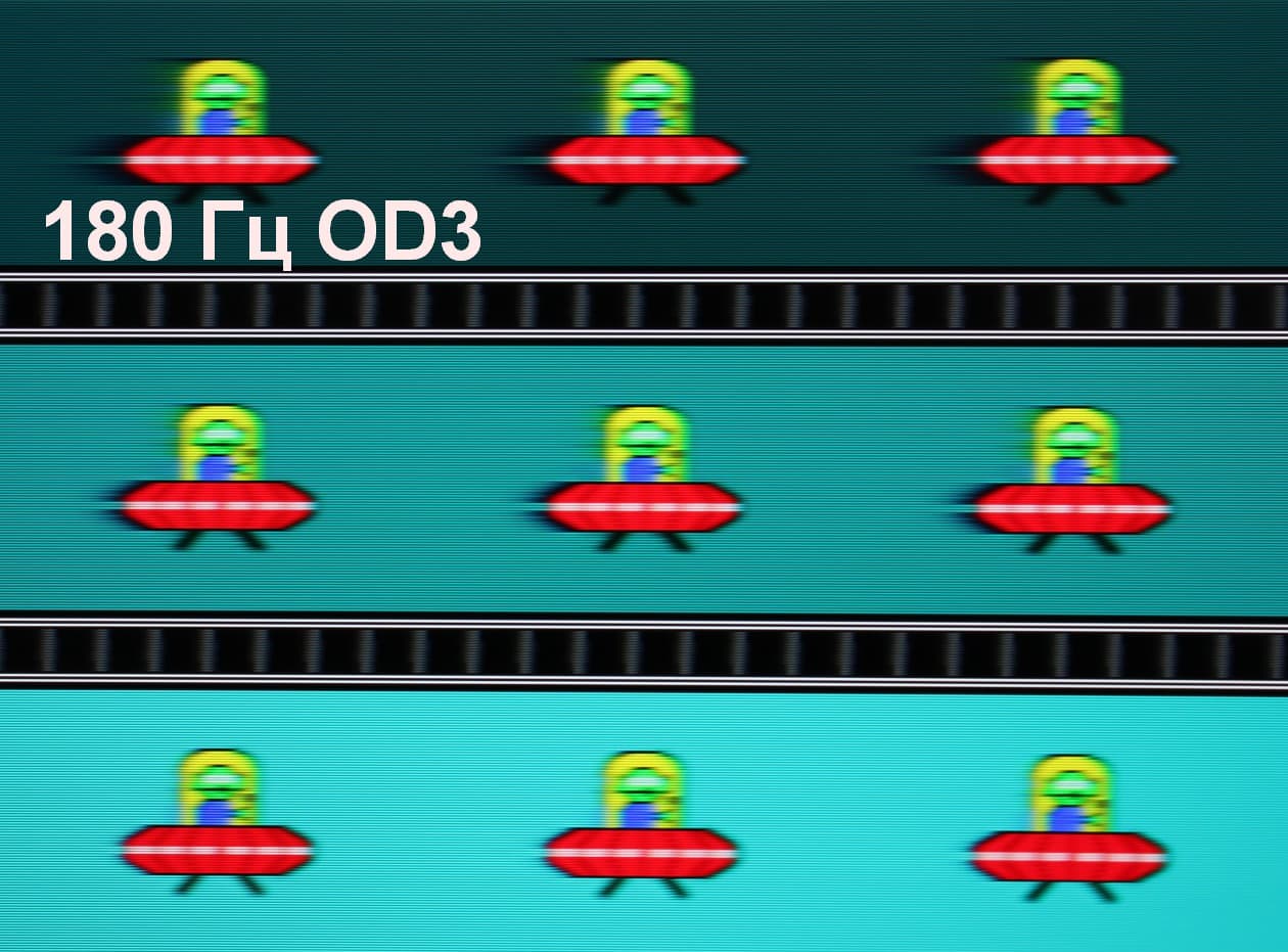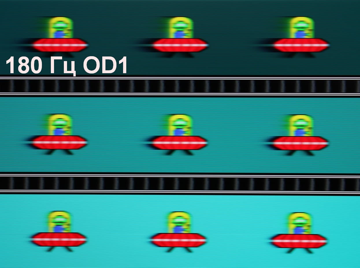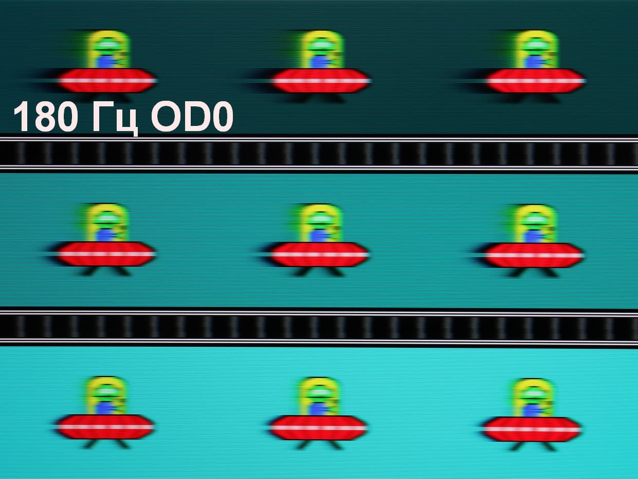 Для наглядного представления о том, что на практике означает такая скорость матрицы, какие могут быть артефакты от разгона и повышает ли четкость в движении, описанная выше настройка MPRT, приведем серию снимков, полученных с помощью движущейся камеры. Такие снимки показывают, что видит человек, если он следит глазами за двигающимся на экране объектом. Описание теста приведено тут, страница с самим тестом тут. Использовались рекомендованные установки (скорость движения 960 пиксель/с для частот обновления 60, 120 и 900 пиксель/с для 180 Гц), выдержка 1/15 с, на фотографиях указаны значения частоты обновления, а также ступень разгона (ODx) и включен ли режим MPRT.