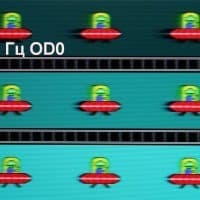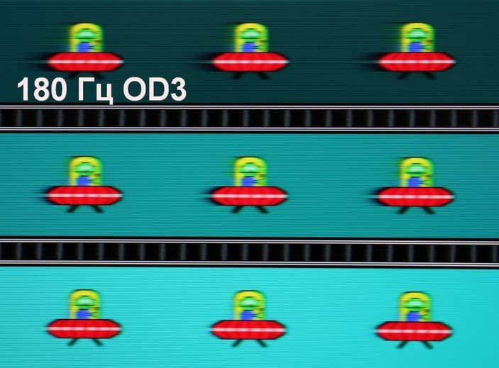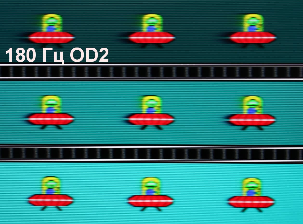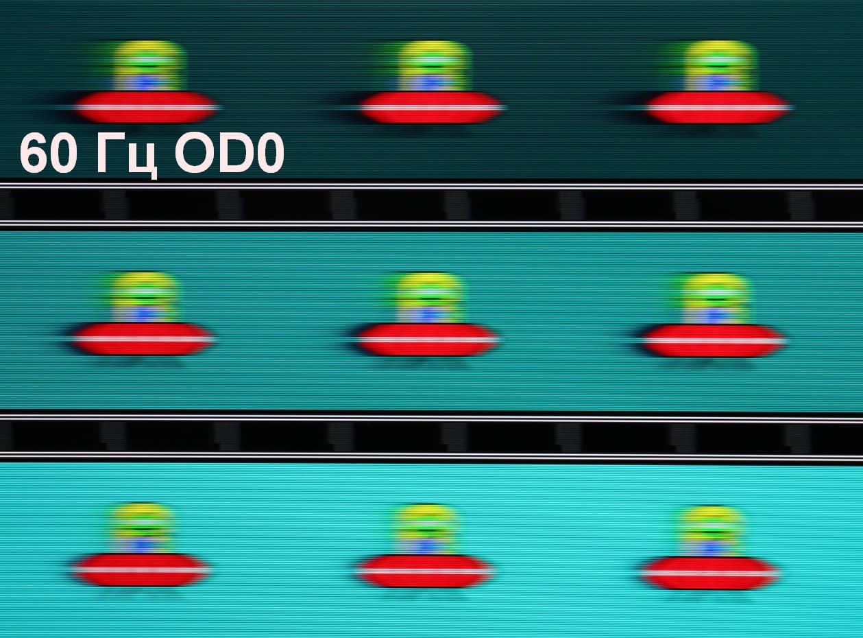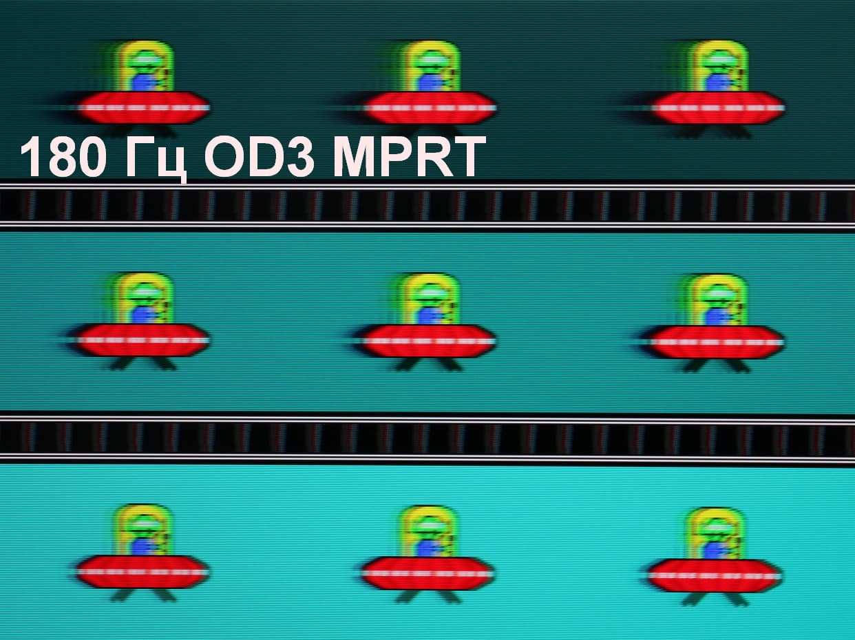 Для наглядного представления о том, что на практике означает такая скорость матрицы, какие могут быть артефакты от разгона и повышает ли четкость в движении, описанная выше настройка MPRT, приведем серию снимков, полученных с помощью движущейся камеры. Такие снимки показывают, что видит человек, если он следит глазами за двигающимся на экране объектом. Описание теста приведено тут, страница с самим тестом тут. Использовались рекомендованные установки (скорость движения 960 пиксель/с для частот обновления 60, 120 и 900 пиксель/с для 180 Гц), выдержка 1/15 с, на фотографиях указаны значения частоты обновления, а также ступень разгона (ODx) и включен ли режим MPRT.