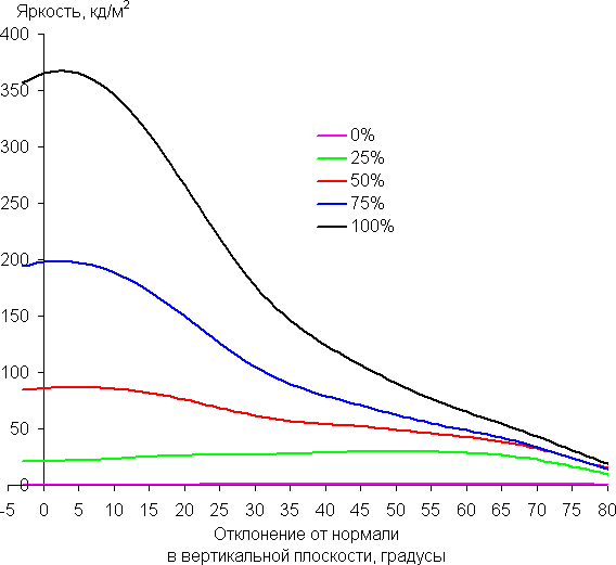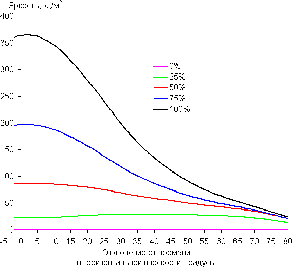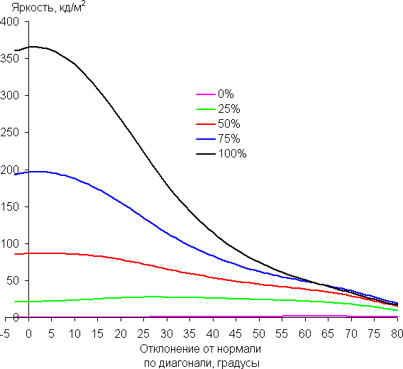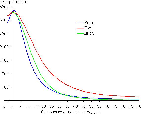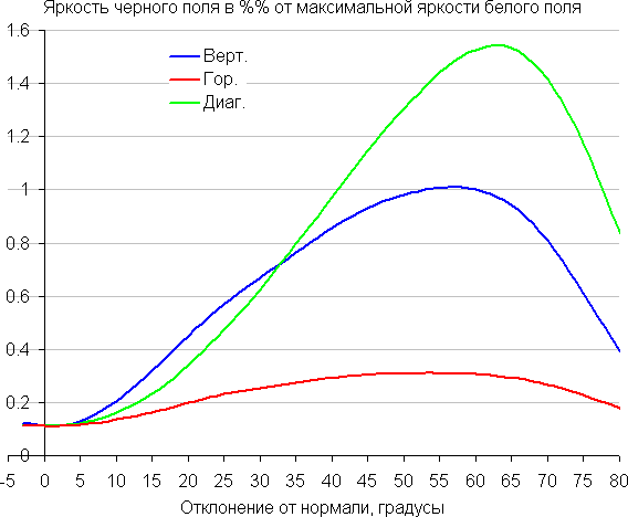 Углы обзора по снижению яркости не очень широкие. При отклонении в диагональном направлении яркость черного поля достигает большего значения, чем в двух других случаях. Однако максимум яркости черного поля все равно гораздо меньше, чем в случае типичного монитора на матрице IPS. Контрастность в диапазоне углов ±82° остается существенно выше значения 10:1.