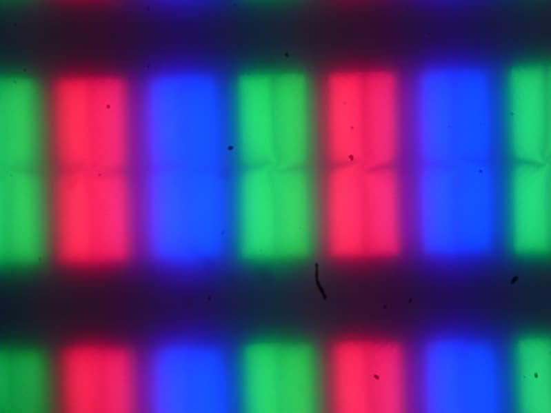 Четкое изображение структуры пикселей из-за матовой поверхности получить не удается, впрочем, на фрагменте ниже можно разглядеть типичную для VA структуру в виде параллельных полосок, а также что каждый субпиксель делится на четыре равных домена, в которых полоски ориентированы под разными углами (черные точки — это пыль на матрице фотоаппарата):