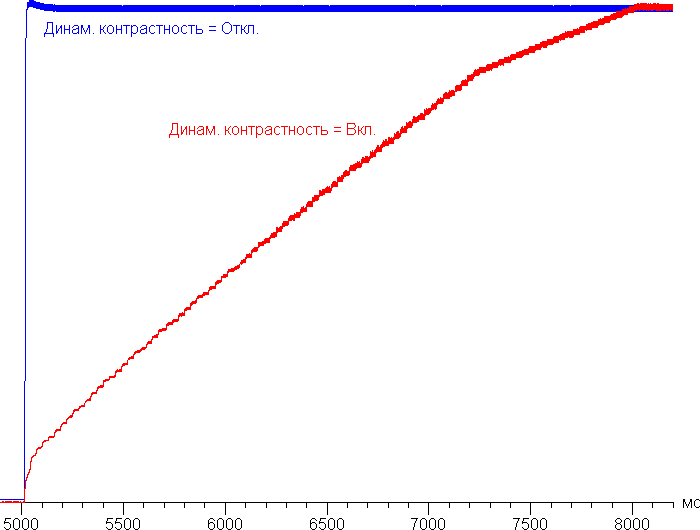 Если включить режим Динам. контрастность, то работает глобальная (на всю площадь экрана) подстройка яркости — на темных сценах яркость подсветки уменьшается, а на черном поле во весь экран через 5,5 с подсветка отключается совсем. График ниже показывает, как увеличивается яркость (вертикальная ось) при переключении с черного поля (после пяти секунд вывода) на белое при выключенной и включенной динамической подстройке яркости: