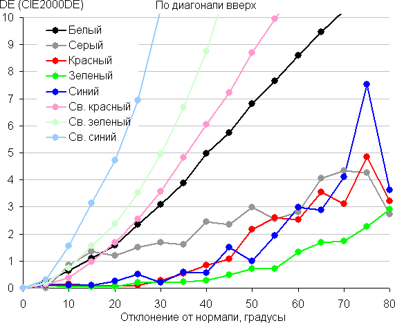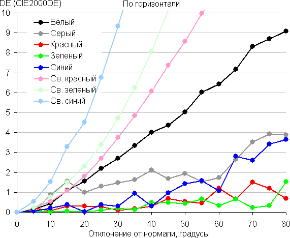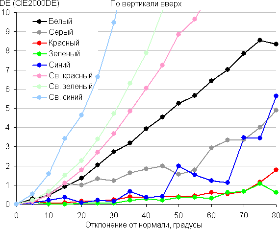 Для количественной характеристики изменения цветопередачи мы провели колориметрические измерения для белого, серого (127, 127, 127), красного, зеленого и синего, а также светло-красного, светло-зеленого и светло-синего полей во весь экран с использованием установки, подобной той, что применялась в предыдущем тесте. Измерения проводились в диапазоне углов от 0° (датчик направлен перпендикулярно к экрану) до 80° с шагом в 5°. Полученные значения интенсивностей были пересчитаны в ΔE относительно замера каждого поля при перпендикулярном положении датчика относительно экрана. Результаты представлены ниже: