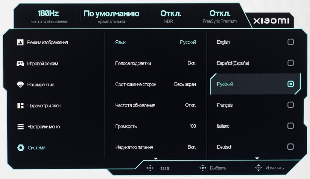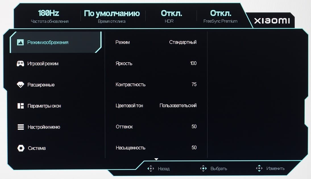 Если на экране оно, то нажатие на джойстик — выключение монитора, а отклонение — те же действия, что и без меню на экране. Далее при навигации по меню в нижней его части выводятся подсказки по текущим функциям джойстика. Меню достаточно крупное, масштаб позволяет оценить снимок ниже, где видна вся область отображения монитора: