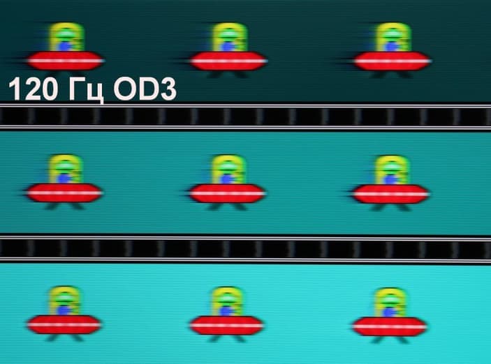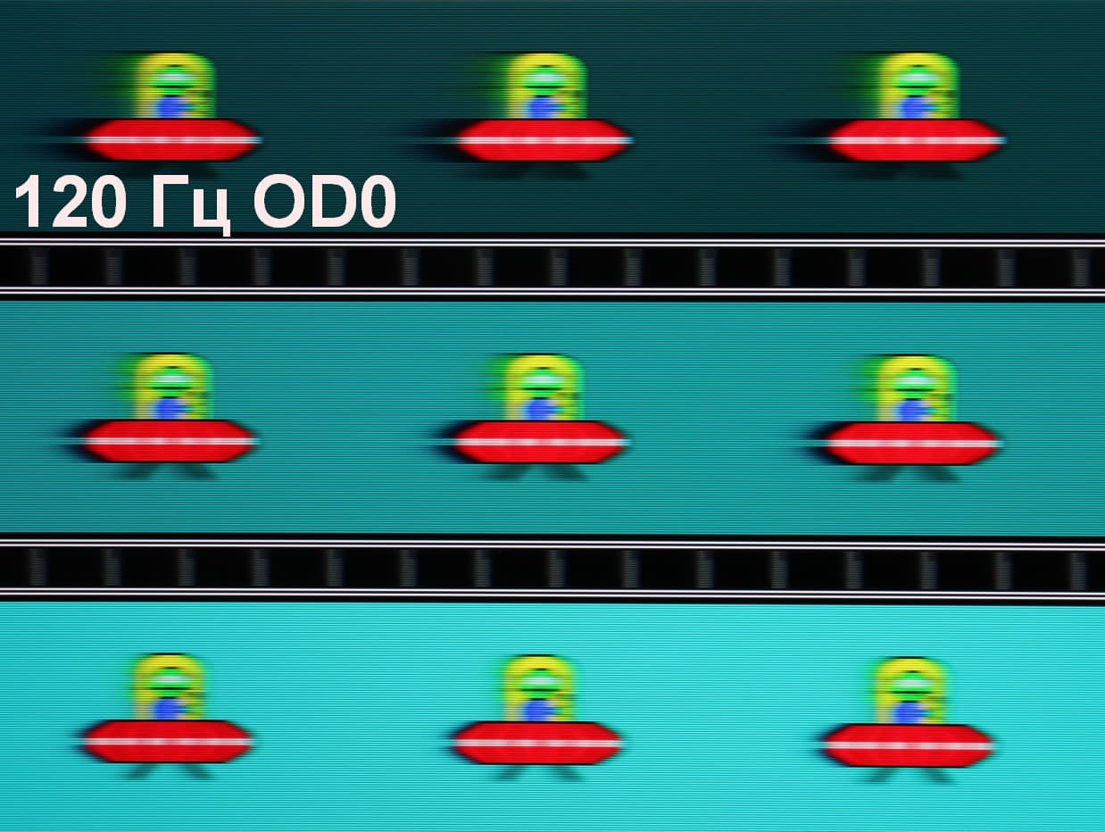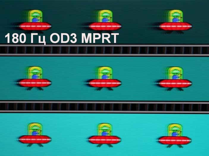 Видно, что при прочих равных условиях четкость изображения повышается по мере роста частоты обновления и степени разгона. Включение MPRT увеличивает четкость, но объекты в движении троятся, что снижает положительный эффект. С нашей точки зрения оптимальным по четкости является режим 120 Гц с максимальным разгоном.