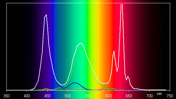Ниже приведен спектр для белого поля (белая линия), наложенный на спектры красного, зеленого и синего полей (линии соответствующих цветов), когда в явном виде нет корректировки цветового охвата