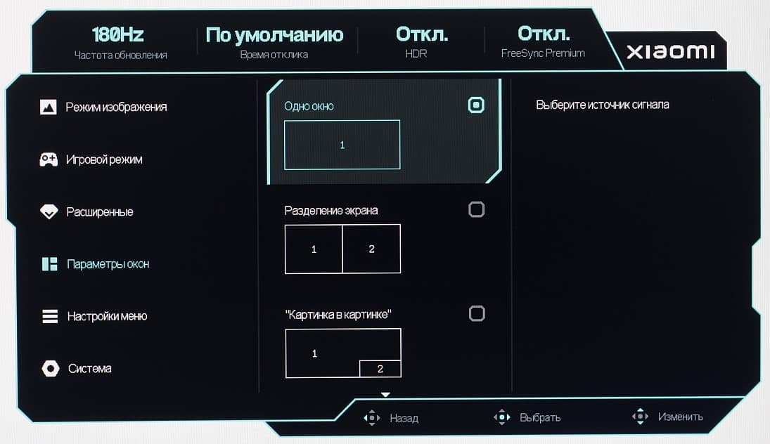 В режиме PIP выбирается положение дополнительного окна в одном из четырех углов, а также его размер из трех возможных. Изображение в дополнительном окне выводится с сохранением исходных пропорций, а если соотношение сторон исходного изображения меньше 21:9, то по бокам выводятся черные полосы. В режиме PBP можно получить два изображения 1720×1440 с выводом точка в точку от независимых источников с заполнением всей области отображения.