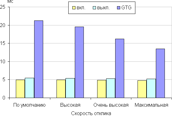 Время отклика зависит от значения настройки Скорость отклика, которая управляет разгоном матрицы. Ступеней регулировки четыре. Диаграмма ниже показывает, как меняется время включения и выключения при переходе черный-белый-черный (столбики «вкл.» и «выкл.»), а также среднее суммарное время для переходов между полутонами (столбики GTG) в случае режима с частотой обновления 180 Гц: