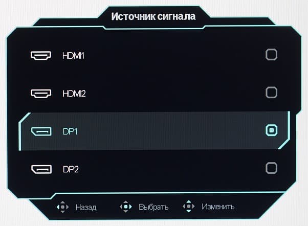 Монитор оснащен четырьмя цифровыми входами в полноразмерном варианте — пара DisplayPort и пара HDMI. Выбор входа осуществляется в стартовом меню. Есть отключаемая функция автоматического поиска сигнала на входах.