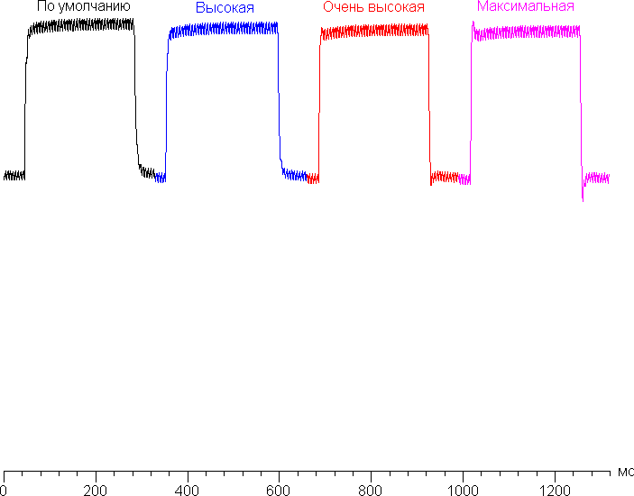 Ниже приведены графики полутонового перехода между оттенками 70% и 90% и обратно при различных значениях настройки Скорость отклика (по вертикали — яркость, по горизонтали — время, для наглядности графики выстроены последовательно):