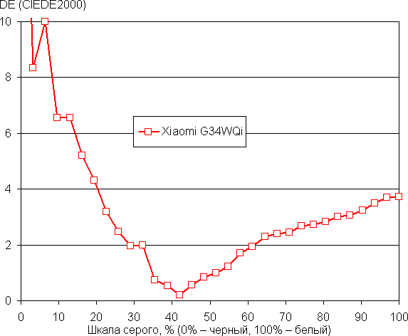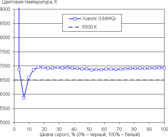 Цветовой баланс просто при выборе профиля Пользовательский без коррекции, который обеспечивает максимальную яркость и контрастность с сохранением приемлемого качества изображения, хороший, так как цветовая температура достаточно близка к стандартным 6500 К, и отклонение от спектра абсолютно черного тела (параметр ΔE) ниже 10 единиц, что для потребительского устройства считается приемлемым показателем. При этом оба параметра мало изменяются на различных участках шкалы серого, что улучшает визуальное восприятие цветового баланса.