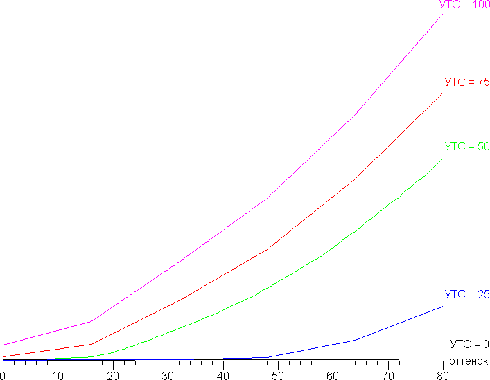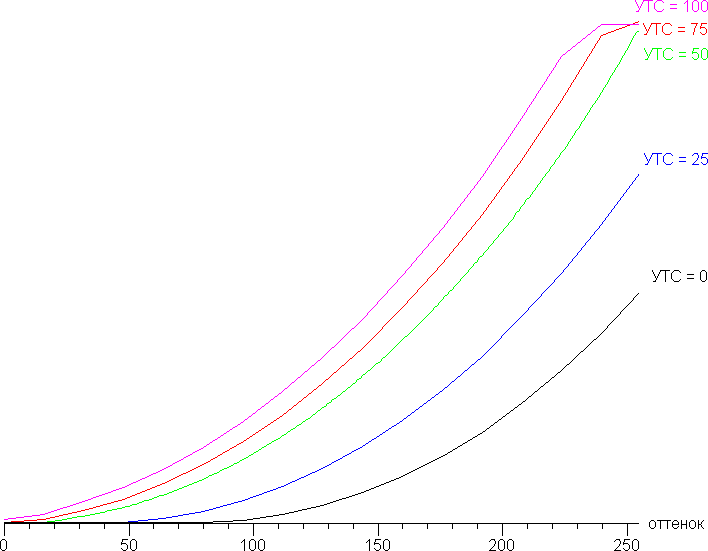 Дополнительной настройкой Улучшение темных сцен (сократим до УТС; значения от 0 до 100 с шагом 1, по умолчанию 50) можно скорректировать гамма-кривую, улучшая или ухудшая различимость деталей в тенях. Это может быть полезно в играх с темными сценами. Ниже приведены гамма-кривые при нескольких значениях УТС (построенные по 16 точкам):