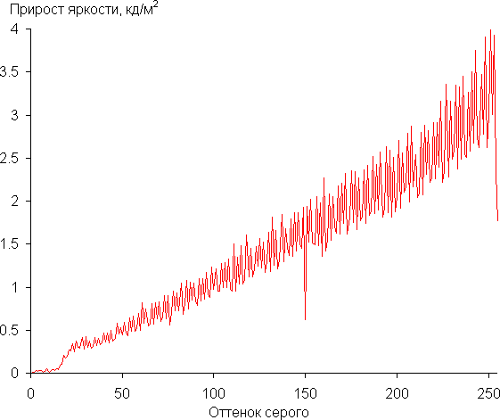 Реальная гамма-кривая ближе всего к стандартной при выборе варианта Гамма 2.2, поэтому далее мы измерили яркость 256 оттенков серого (от 0, 0, 0 до 255, 255, 255) при этом значении. График ниже показывает прирост (не абсолютное значение!) яркости между соседними полутонами: