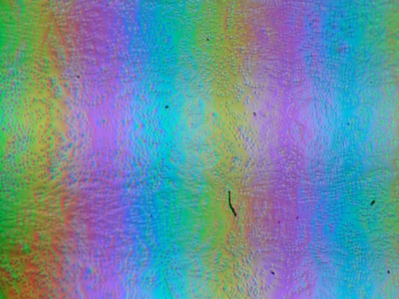 Зерно этих дефектов в несколько раз меньше размеров субпикселей (масштаб этих двух фотографий одинаковый), поэтому фокусировка на микродефектах и «перескок» фокуса по субпикселям при изменении угла зрения выражены слабо, из-за этого нет и «кристаллического» эффекта.