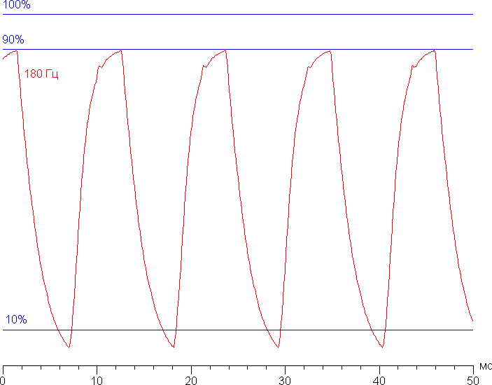 Видно, что при 180 Гц чередования максимальная яркость белого кадра близка к уровню 90% белого, а минимальная яркость черного кадра ниже 10%. Амплитуда изменения яркости больше 80% от уровня белого. То есть согласно этому формальному критерию скорости матрицы достаточно для вывода изображения с кадровой частотой 180 Гц.
