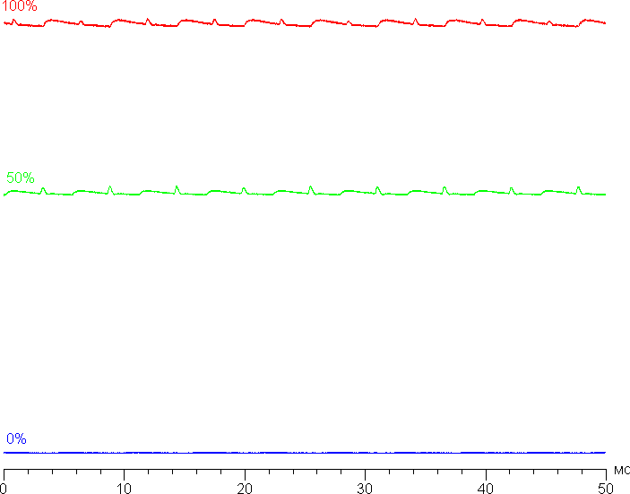 Яркость монитора меняется именно яркостью подсветки, то есть без ущерба для качества изображения (сохраняется контрастность и количество различимых градаций) яркость монитора можно менять в довольно широких пределах, что позволяет с комфортом играть, работать и смотреть фильмы как в освещенном, так и в темном помещении. На любом уровне яркости значимая модуляция подсветки отсутствует, что исключает видимое мерцание экрана. Для тех, кто привык распознавать знакомое сокращение, уточним: ШИМ отсутствует. В доказательство приведем графики зависимости яркости (вертикальная ось) от времени (горизонтальная ось) при различных значениях настройки яркости: