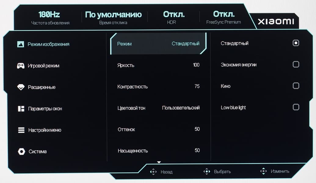 Настроек, изменяющих яркостный и цветовой баланс не очень много. Присутствует набор предустановленных значений настроек в виде редактируемых профилей — четырех обычных и трех игровых.