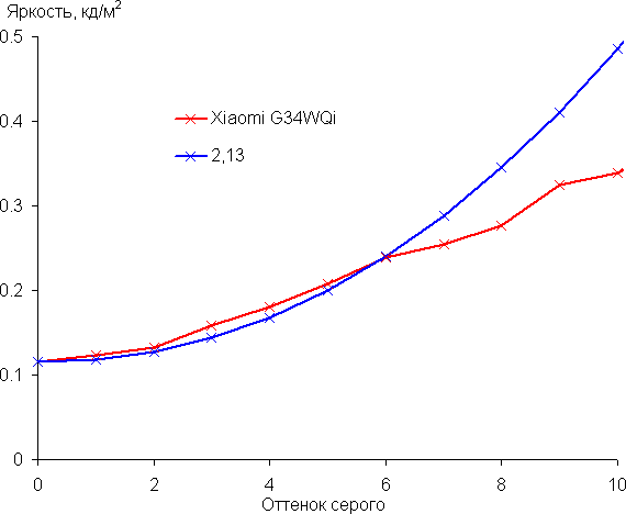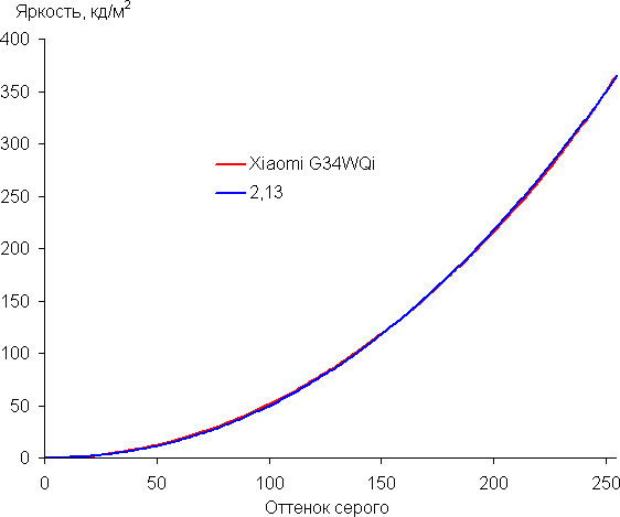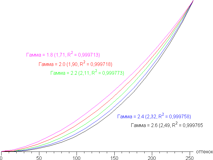 Аппроксимация полученной гамма-кривой дала показатель 2,13, что немного ниже стандартного значения 2,2, при этом реальная гамма-кривая мало отклоняется от аппроксимирующей степенной функции: