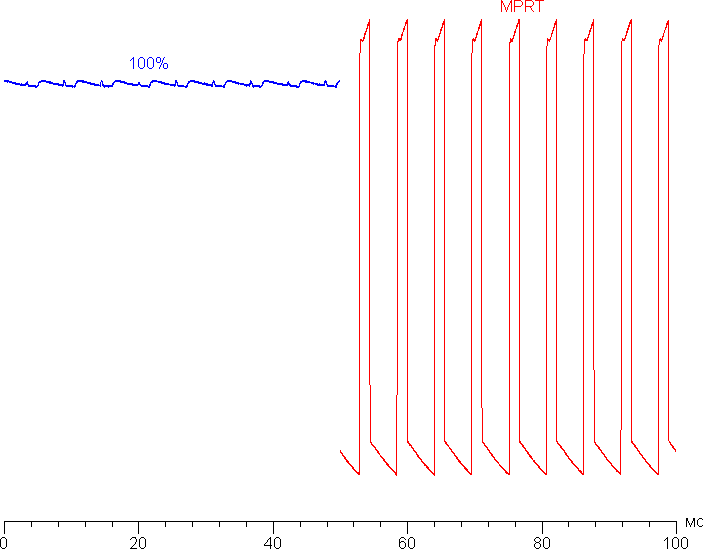 Есть режим со вставкой темного кадра (черным он в данном случае не является) с названием MPRT. Зависимости яркости (вертикальная ось) от времени (горизонтальная ось), когда яркость установлена на максимум (левая половина), и когда включена функция MPRT (правая половина):