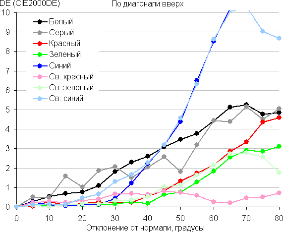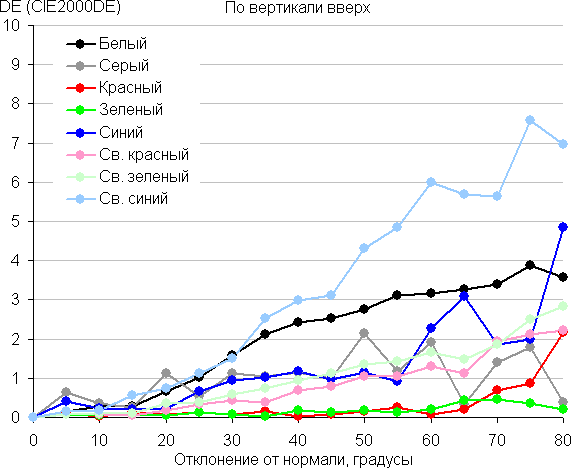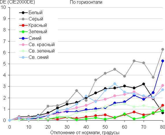 Для количественной характеристики изменения цветопередачи мы провели колориметрические измерения для белого, серого (127, 127, 127), красного, зеленого и синего, а также светло-красного, светло-зеленого и светло-синего полей во весь экран с использованием установки, подобной той, что применялась в предыдущем тесте. Измерения проводились в диапазоне углов от 0° (датчик направлен перпендикулярно к экрану) до 80° с шагом в 5°. Полученные значения интенсивностей были пересчитаны в ΔE относительно замера каждого поля при перпендикулярном положении датчика относительно экрана. Результаты представлены ниже: