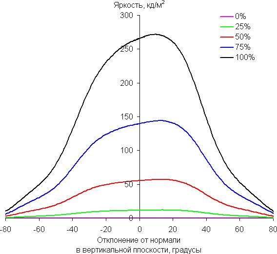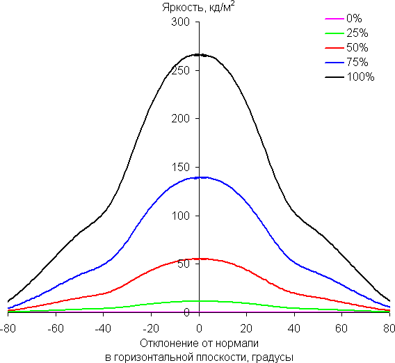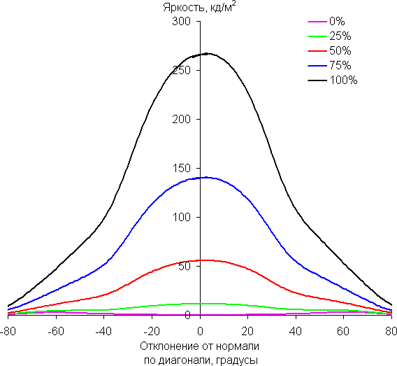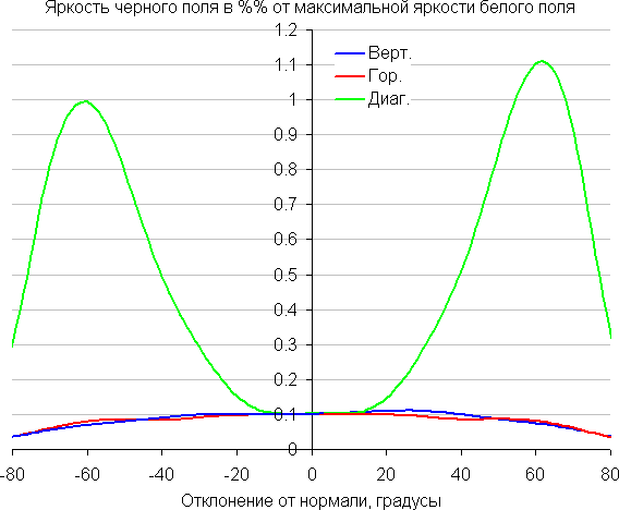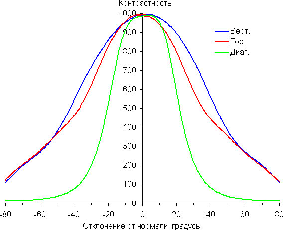 Отметим плавное уменьшение яркости при отклонении от перпендикуляра к экрану в довольно широком диапазоне углов и во всех трех направлениях, при этом графики не пересекаются во всем диапазоне измеряемых углов. Однако по скорости снижения яркости углы обзора относительно узкие. При отклонении в диагональном направлении яркость черного поля начинает резко возрастать уже при 20°-30° отклонения от перпендикуляра к экрану. Если сидеть не очень далеко от экрана, то черное поле по углам будет заметно светлее, чем в центре, и иметь легкий фиолетовый оттенок. Контрастность в диапазоне углов ±82° в случае отклонения по диагонали вплотную приближается к отметке 10:1, но все же не опускается ниже.