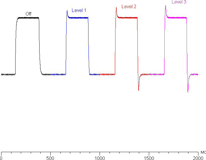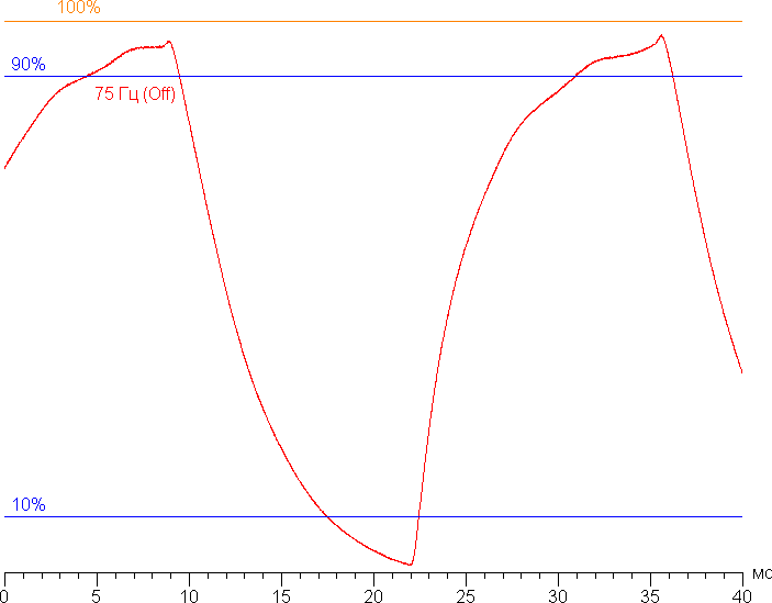 Визуально артефакты особо не видно даже в случае максимального разгона. С нашей точки зрения, на последнем уровне разгона скорости матрицы достаточно для динамичных игр. Приведем зависимость яркости (вертикальная ось) от времени (горизонтальная ось) при чередовании белого и черного кадра при 75 Гц кадровой частоты в случае Overdrive = Off: