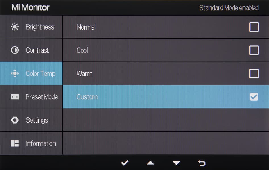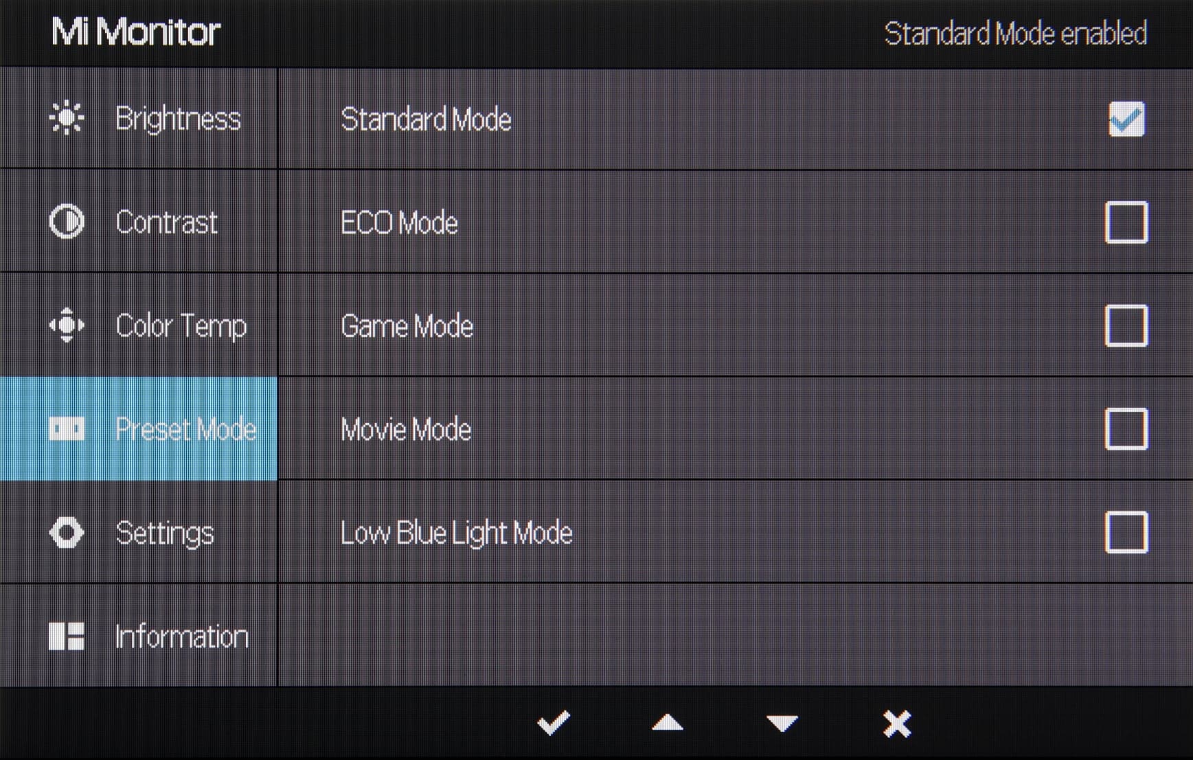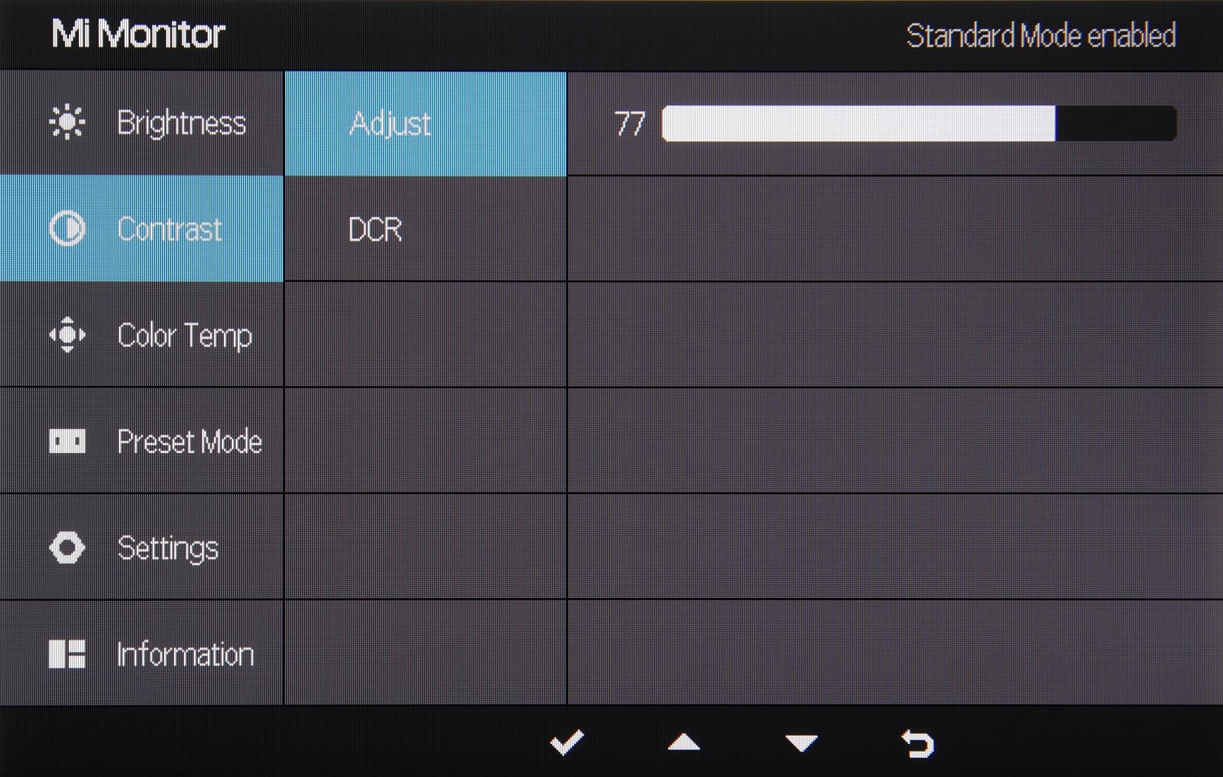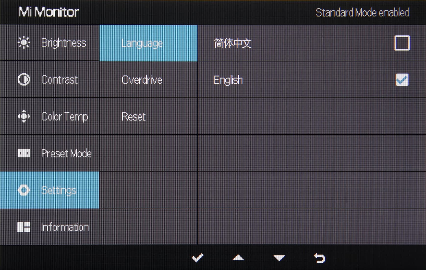 Надписи в меню достаточно крупные и читаемые. В нижней части меню точно над кнопками выводятся значки-подсказки по текущим функциям кнопок. Навигация по меню из-за кнопок не очень удобная, но привыкнуть можно. Единственное преимущество этих кнопок в том, что они не закрываются при установке мониторов встык друг с другом. Изначально меню на китайском, но его достаточно просто переключить на английский язык.
