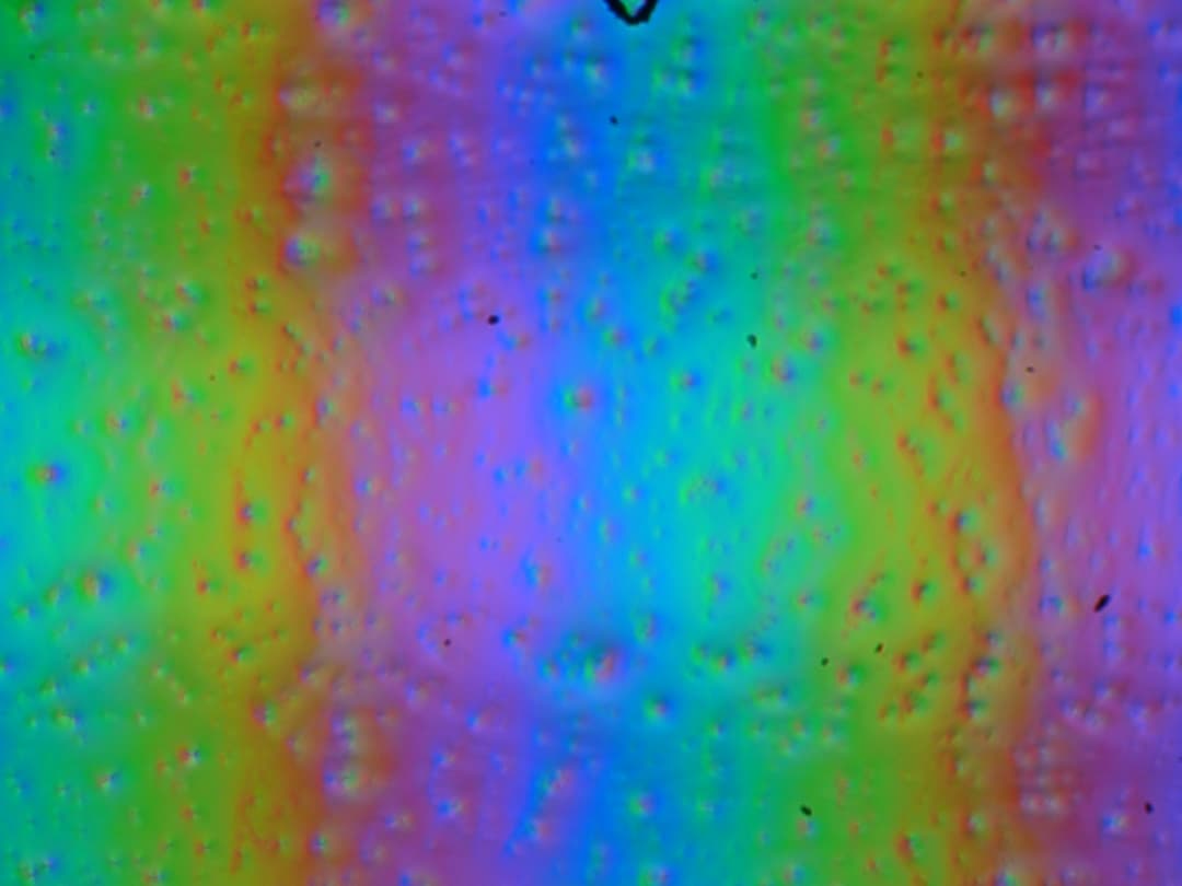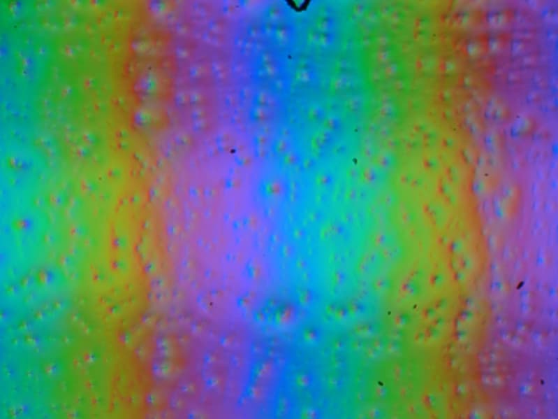 Зерно этих дефектов в несколько раз меньше размеров субпикселей (масштаб этих двух фотографий одинаковый), поэтому фокусировка на микродефектах и «перескок» фокуса по субпикселям при изменении угла зрения выражены слабо, из-за этого нет и «кристаллического» эффекта.