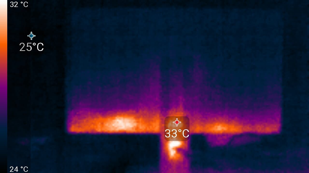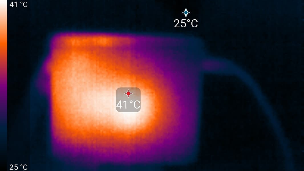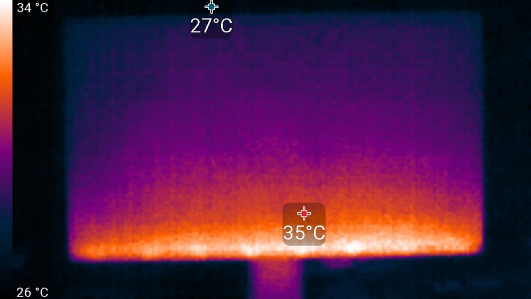 Нижний край экрана нагрелся до 35 °C максимум. Видимо, внизу находится светодиодная линейка подсветки экрана. Нагрев сзади умеренный:
