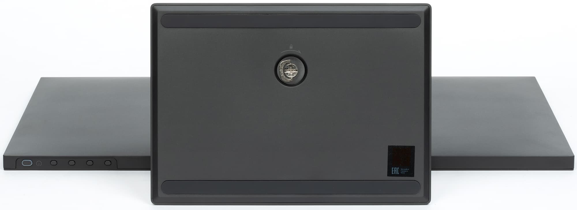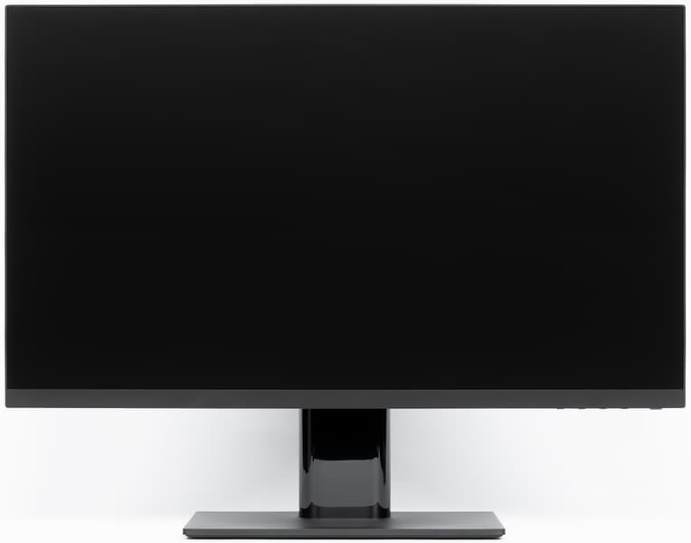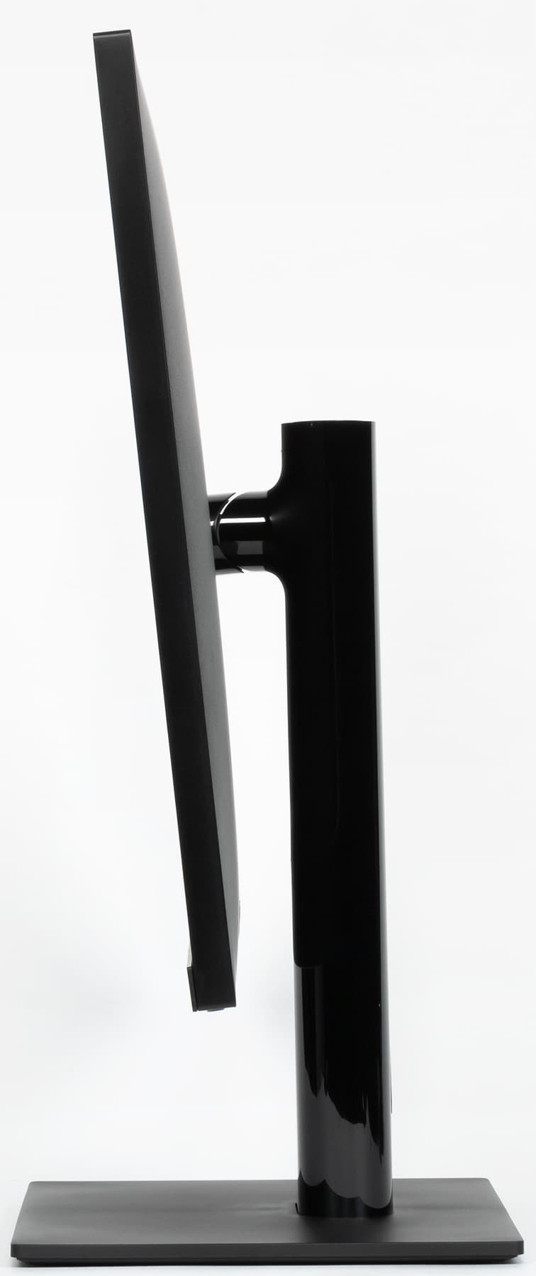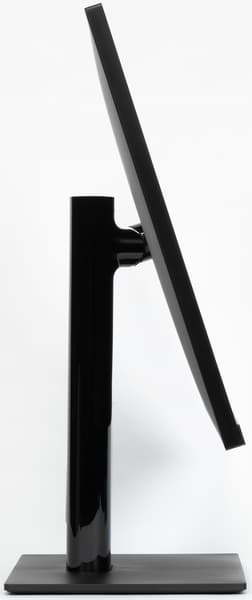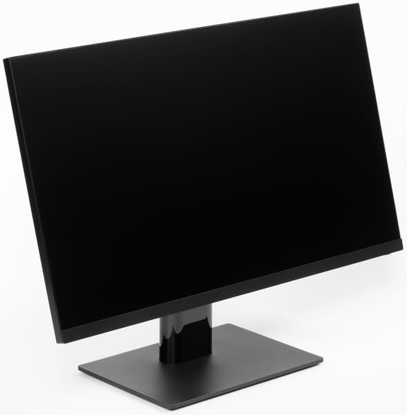 Внешняя поверхность матрицы черная, полуматовая, зеркальность выражена. Экран выглядит как монолитная поверхность, ограниченная снизу пластиковой планкой, а сверху и с боков — узкой пластиковой окантовкой. Выведя изображение на экран, можно увидеть, что на самом деле между внешними границами экрана и собственно областью отображения есть неширокие поля — по 6 мм до внешних краев сверху и по бокам и 1,5 мм до планки снизу. Окантовка, планка и задняя панель блока экрана изготовлены из черного пластика с матовой поверхностью, глянцевыми выполнены только небольшие участки на задней панели, образующие логотип производителя. Кожухи основания подставки, верхний торец стойки подставки и торцы адаптера питания также черные пластиковые и матовые, а боковые поверхности стойки подставки и адаптера — глянцевые. Глянцевый черный пластик не выглядит хорошим решением, так как на нем заметны следы от пальцев и любые повреждения. В итоге такие поверхности через какое-то время, точнее почти сразу после снятия защитной пленки, выглядят неопрятно.