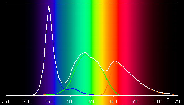 Такой спектр с узким пиком синего и с широкими горбами зеленого и красного цветов характерен для телевизоров/мониторов, в которых используется белая светодиодная подсветка с синим излучателем и желтым люминофором.