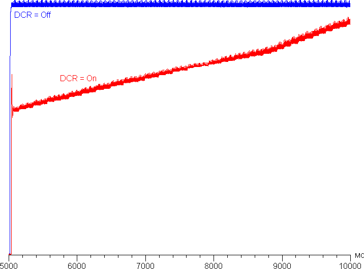 При включении режима DCR установившаяся контрастность формально возрастает до бесконечности, так как на черном поле во весь экран яркость подсветки медленно снижается, и через примерно 5 с она выключается совсем (но белого курсора мыши достаточно для включения подсветки). В принципе, динамическая подстройка яркости может улучшить восприятие темных сцен, но в данном случае скорость изменения яркости подсветки невысокая, поэтому практической пользы от этой функции немного. График ниже показывает, как увеличивается яркость (вертикальная ось) при переключении с черного поля во весь экран (после 5 секунд выдержки) на белое поле во весь экран при выключенной и включенной динамической подстройки яркости: