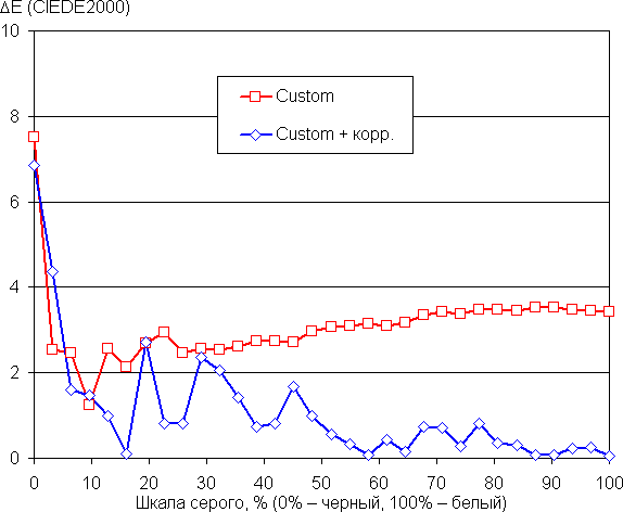 Ручная коррекция приблизила цветовую температуру к 6500 К и уменьшила значение ΔE. Впрочем, особого смысла в такой коррекции нет, можно просто оставить профиль Custom в его первоначальном варианте, тем более, что в этом случае яркость (и контрастность) максимальные.