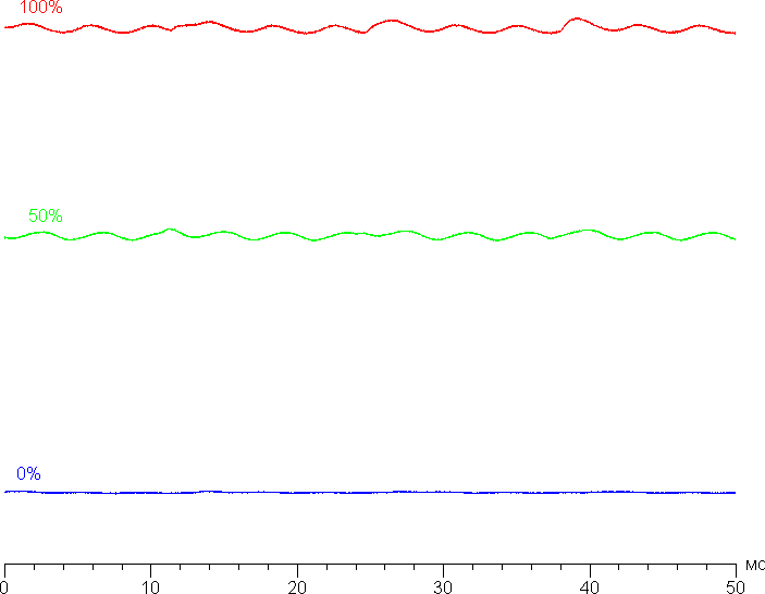 Яркость монитора меняется именно яркостью подсветки, то есть без ущерба для качества изображения (сохраняется контрастность и количество различимых градаций) яркость монитора можно менять в широких пределах, что позволяет с комфортом работать, играть и смотреть фильмы как в освещенном, так и в темном помещении. На любом уровне яркости значимая модуляция подсветки отсутствует, что исключает видимое мерцание экрана. Для тех, кто привык распознавать знакомое сокращение, повторим: ШИМ отсутствует. В доказательство приведем графики зависимости яркости (вертикальная ось) от времени (горизонтальная ось) при различных значениях настройки яркости: