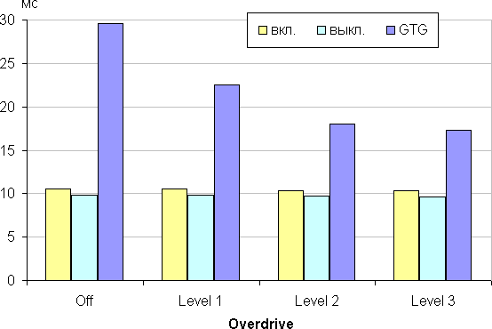Время отклика зависит от значения настройки Overdrive, которая управляет разгоном матрицы. Диаграмма ниже показывает, как меняется время включения и выключения при переходе черный-белый-черный (столбики «вкл.» и «выкл.»), а также среднее суммарное (от первого оттенка до второго и обратно) время для переходов между полутонами (столбики «GTG»):