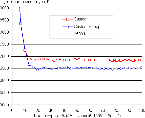 Цветовой баланс просто при выборе профиля Custom для цветовой температуры хороший, так как цветовая температура несильно выше стандартных 6500 К, и отклонение от спектра абсолютно черного тела (ΔE) ниже 4, что для потребительского устройства считается отличным показателем. При этом цветовая температура и ΔE мало изменяются от оттенка к оттенку — это положительно сказывается на визуальной оценке цветового баланса. (Самый близкий к черному диапазон можно не учитывать, так как в нем цветопередача не так важна, а погрешность измерения цветовых характеристик высокая.) Но мы все равно попытались улучшить цветовой баланс, регулируя усиление трех основных цветов. Графики ниже показывают цветовую температуру на различных участках шкалы серого и отклонение от спектра абсолютно черного тела (параметр ΔE) в случае профиля Custom без коррекции и после ручной коррекции (R = 100, G = 97, B = 97):