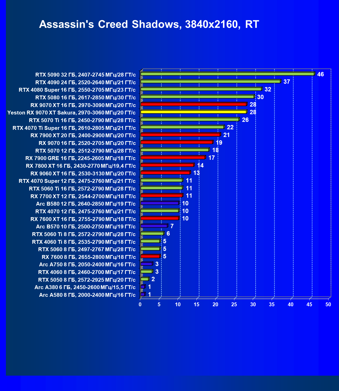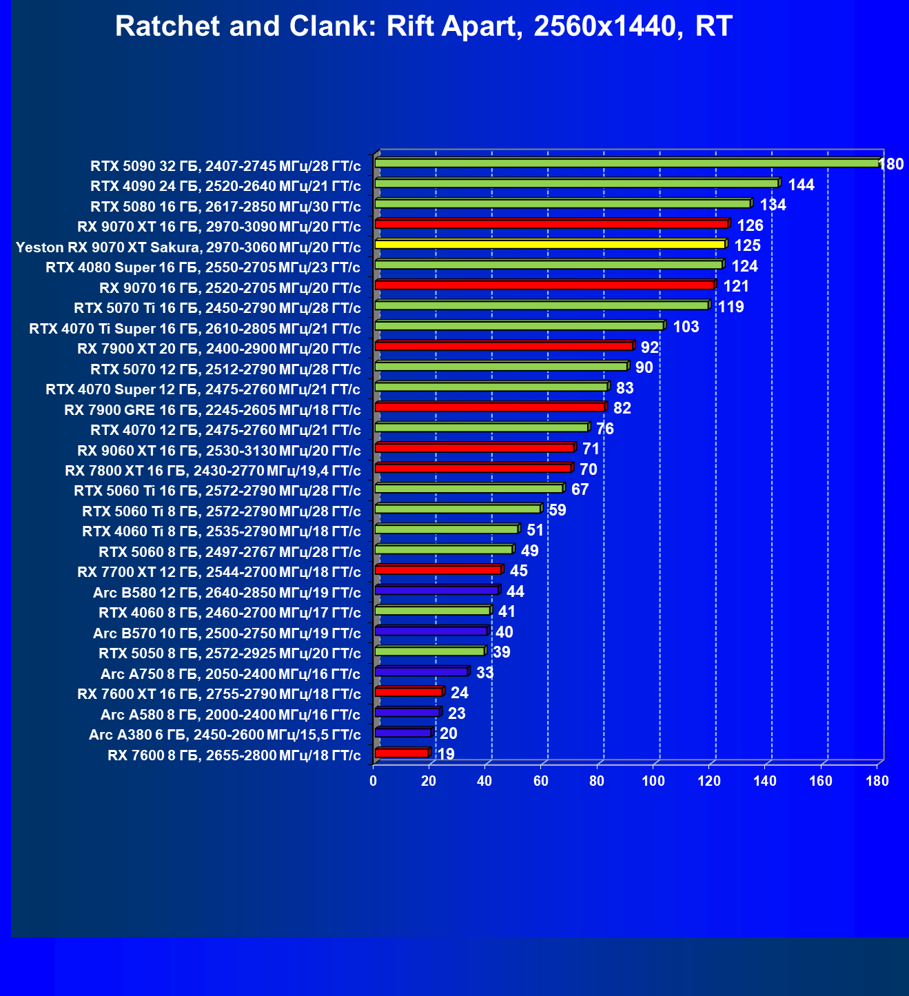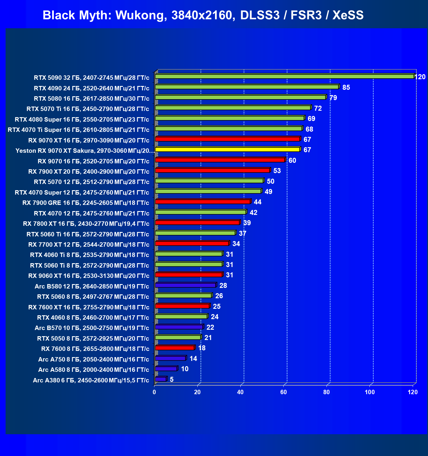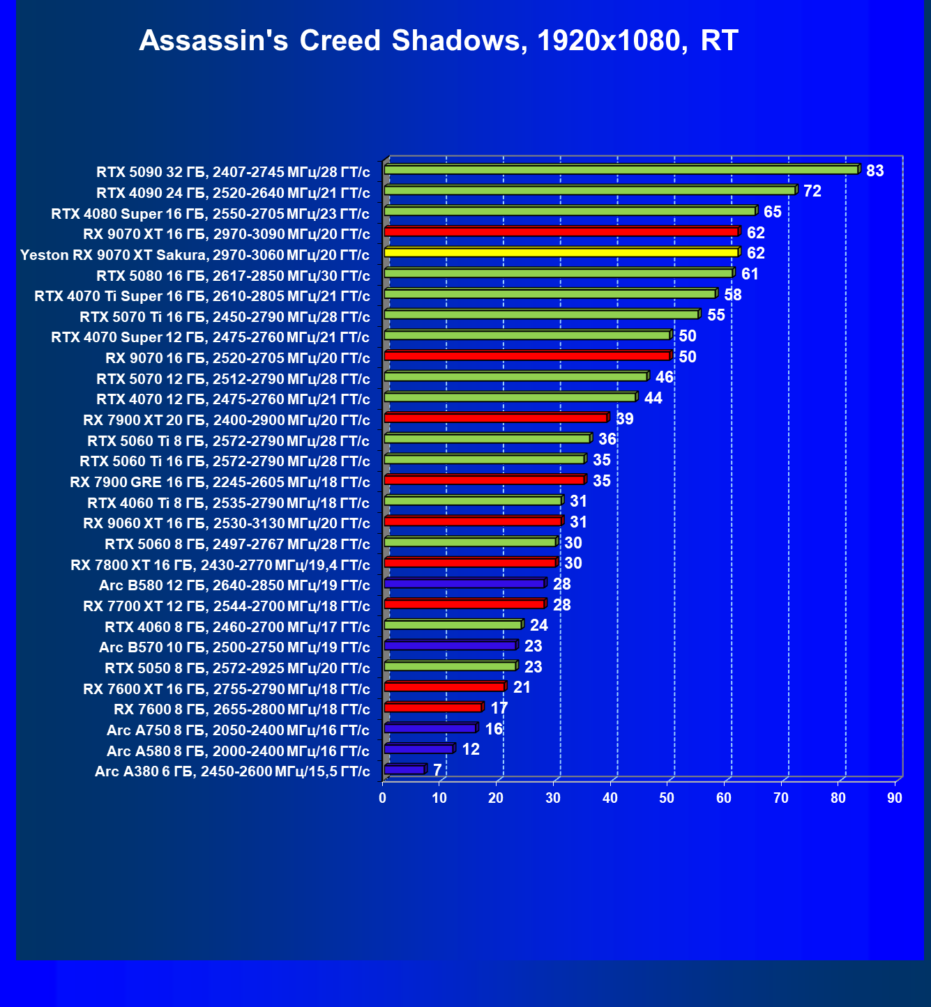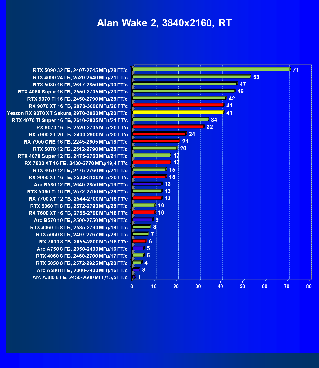| 07 | Yeston RX 9070 XT Sakura, 2970—3060 МГц/20 ГТ/с | 5000 | 649 | 77 000 |