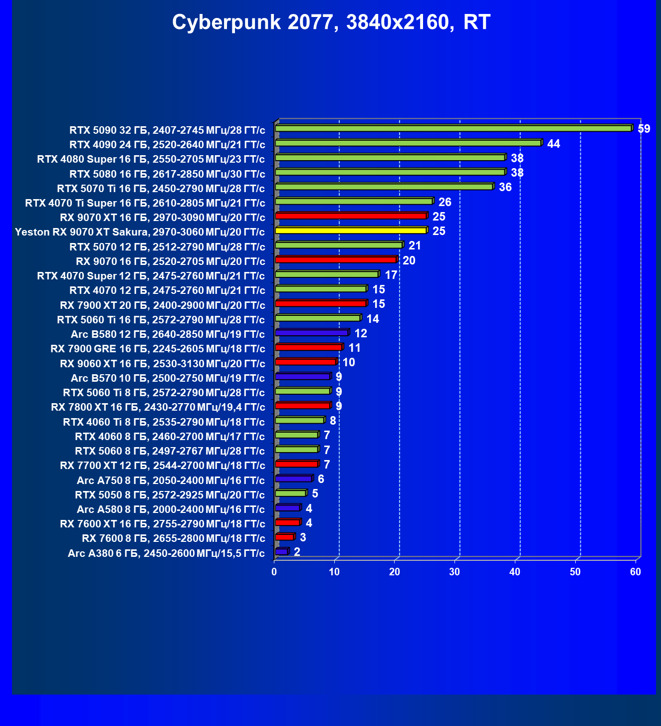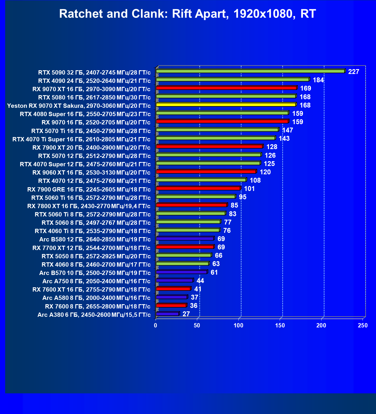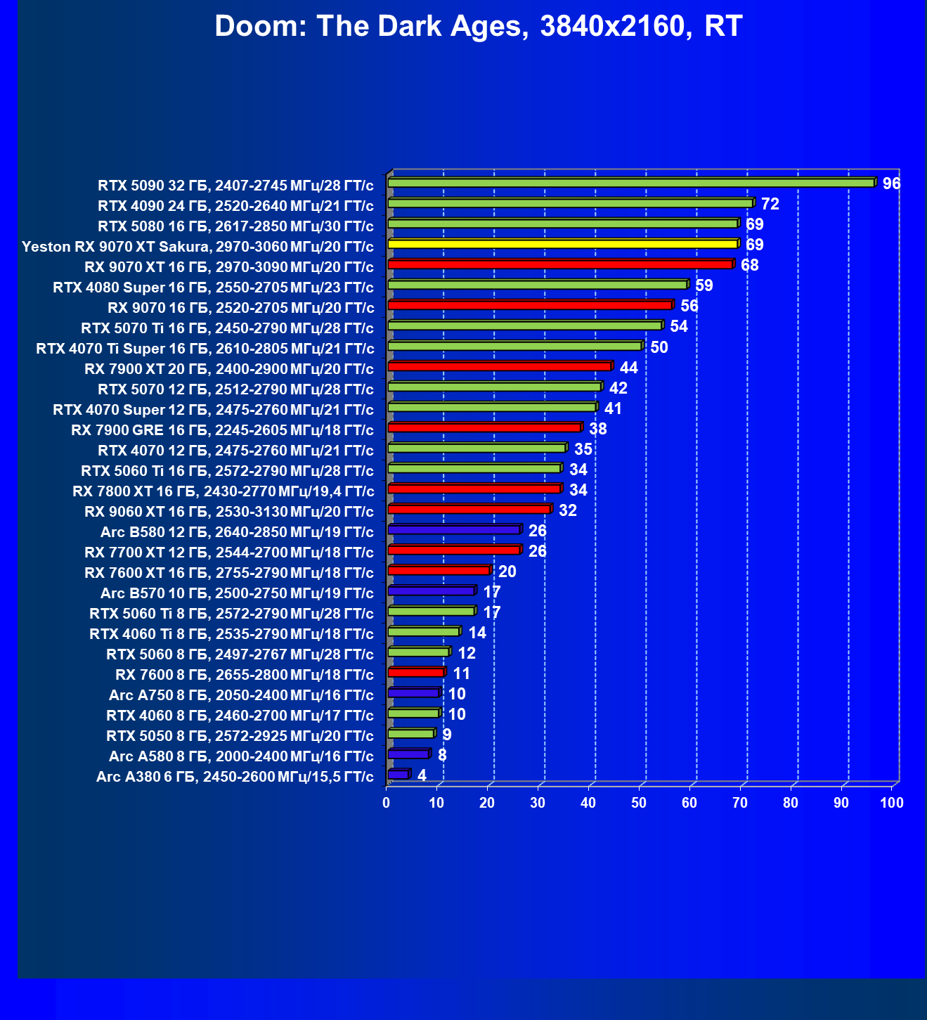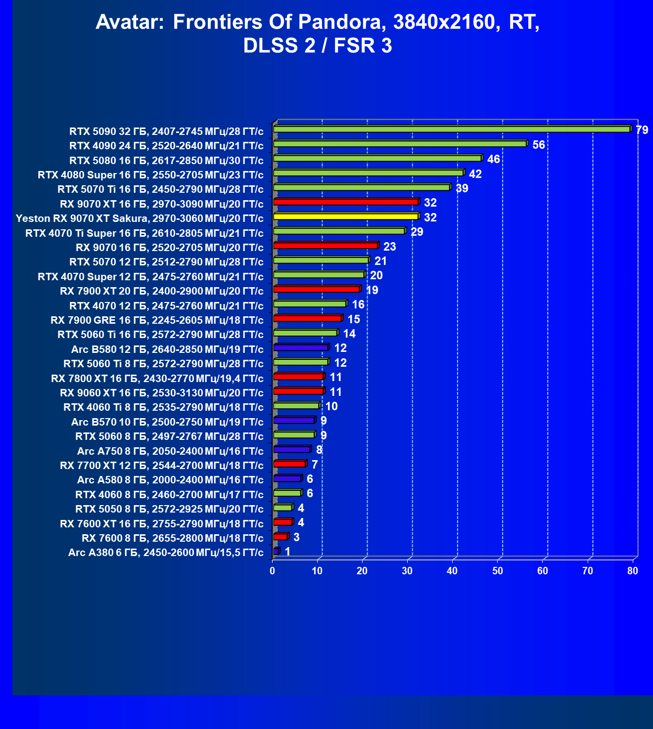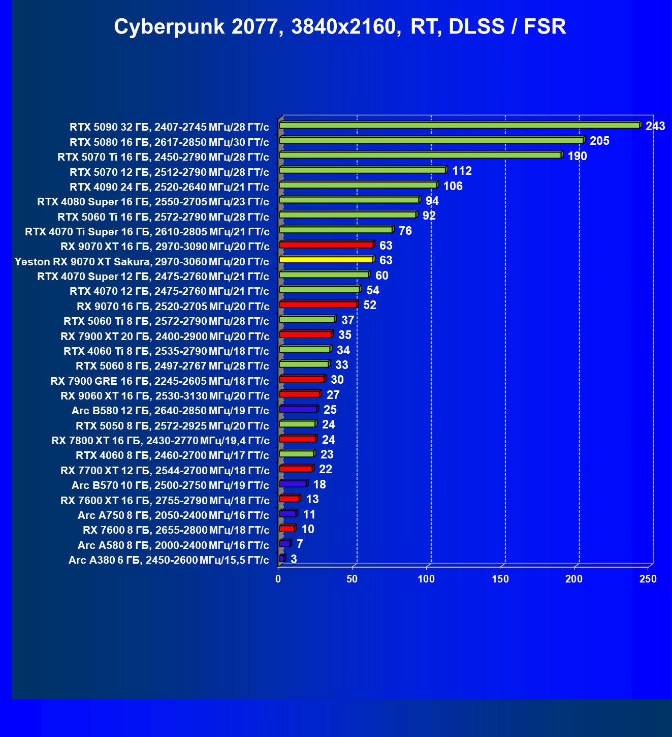 | 08 | Yeston RX 9070 XT Sakura, 2970—3060 МГц/20 ГТ/с | 312 | 2399 | 77 000 |