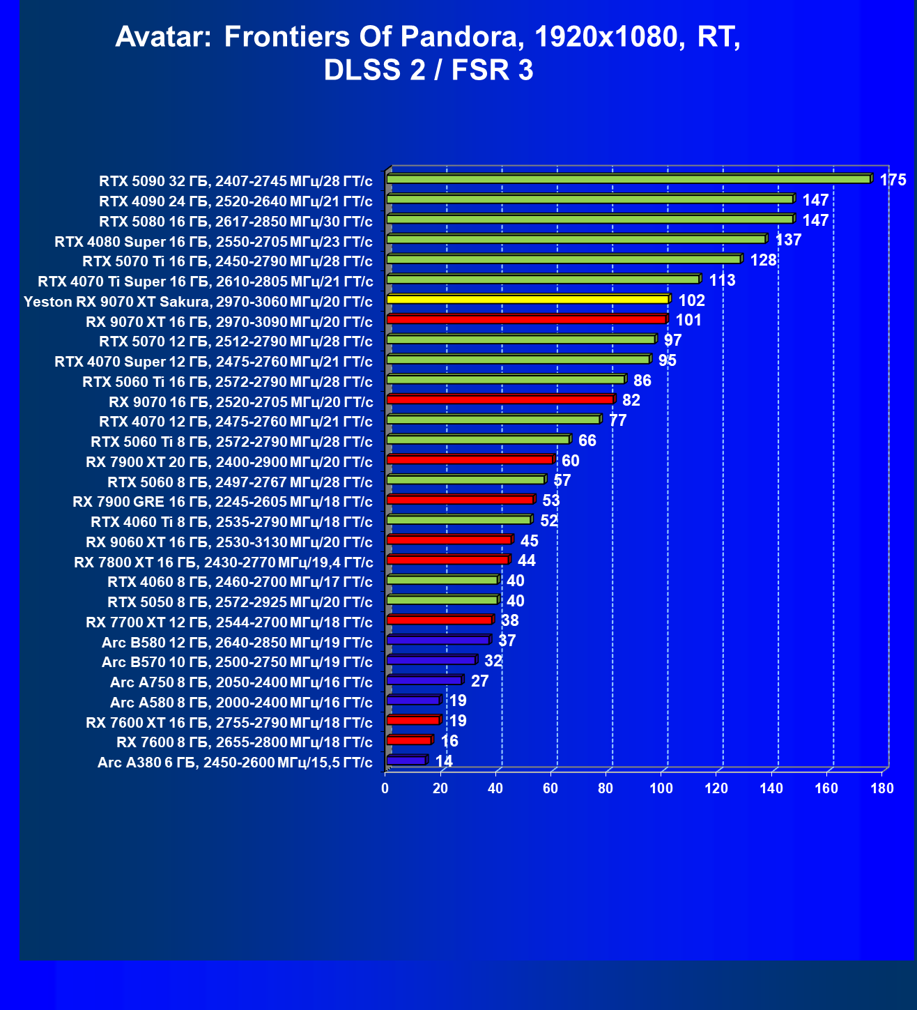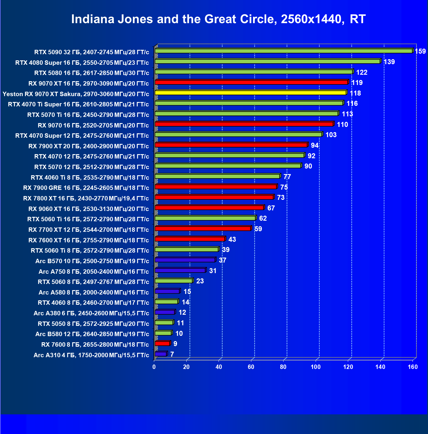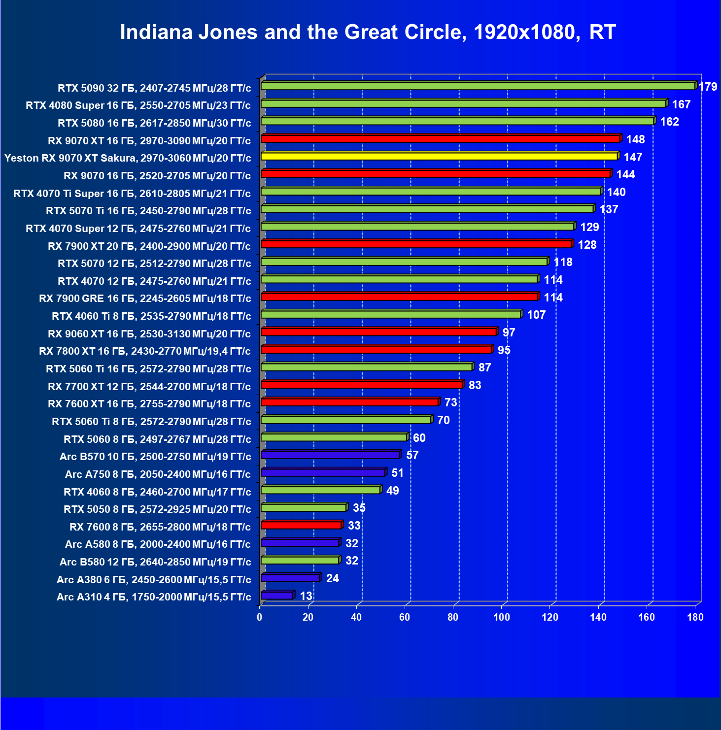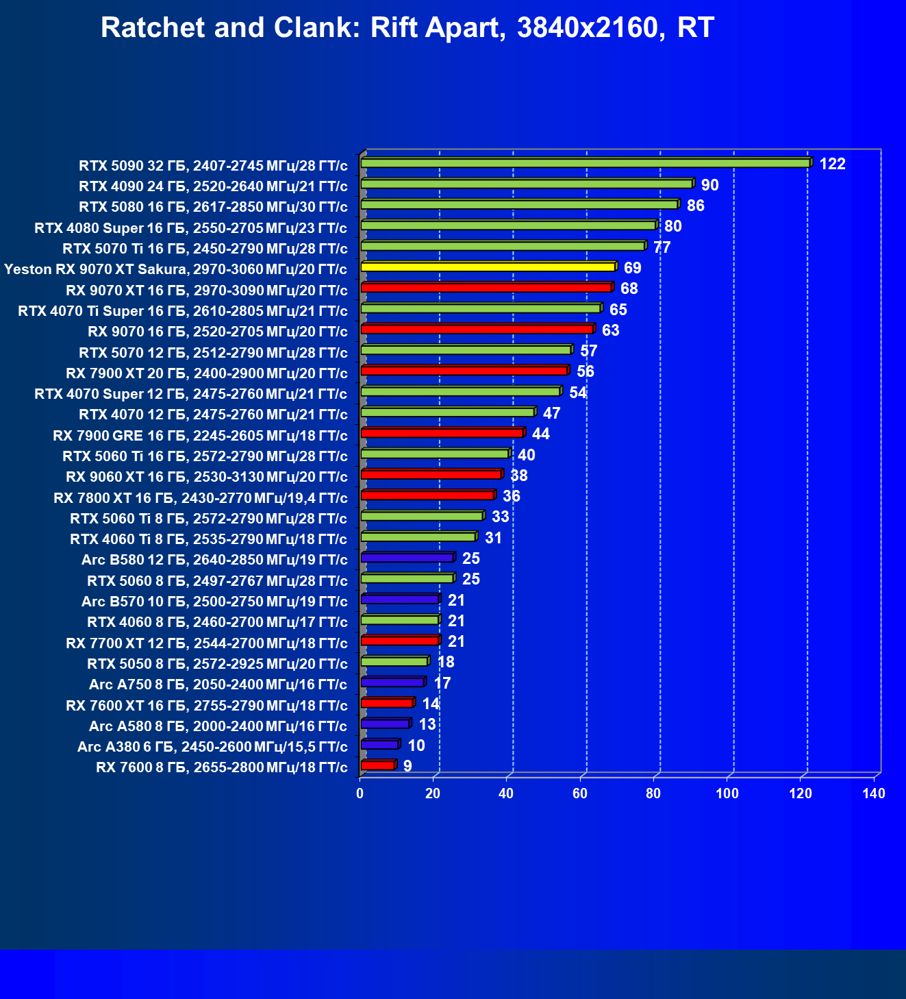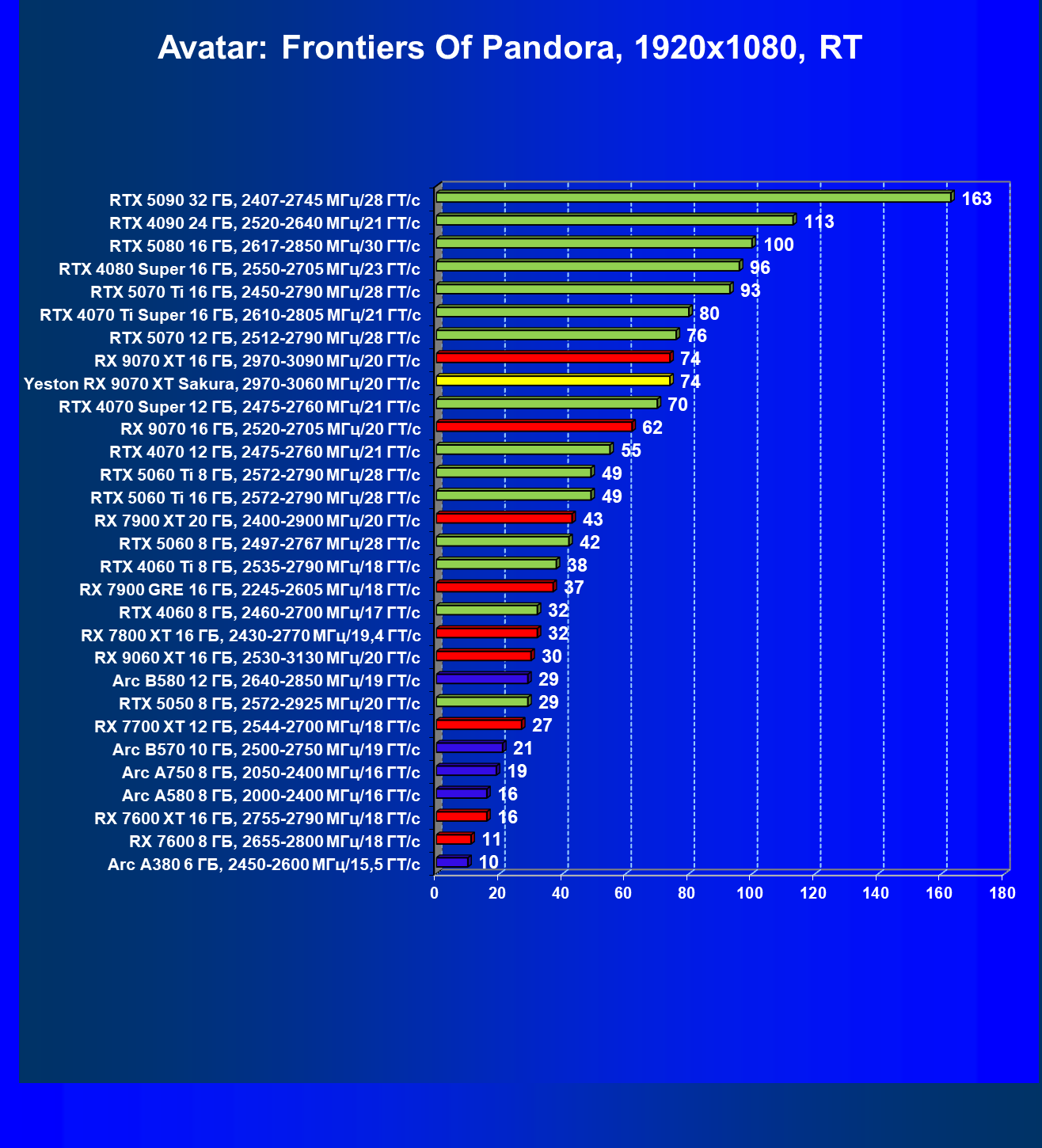 | 08 | Yeston RX 9070 XT Sakura, 2970—3060 МГц/20 ГТ/с | 312 | 2399 | 77 000 |