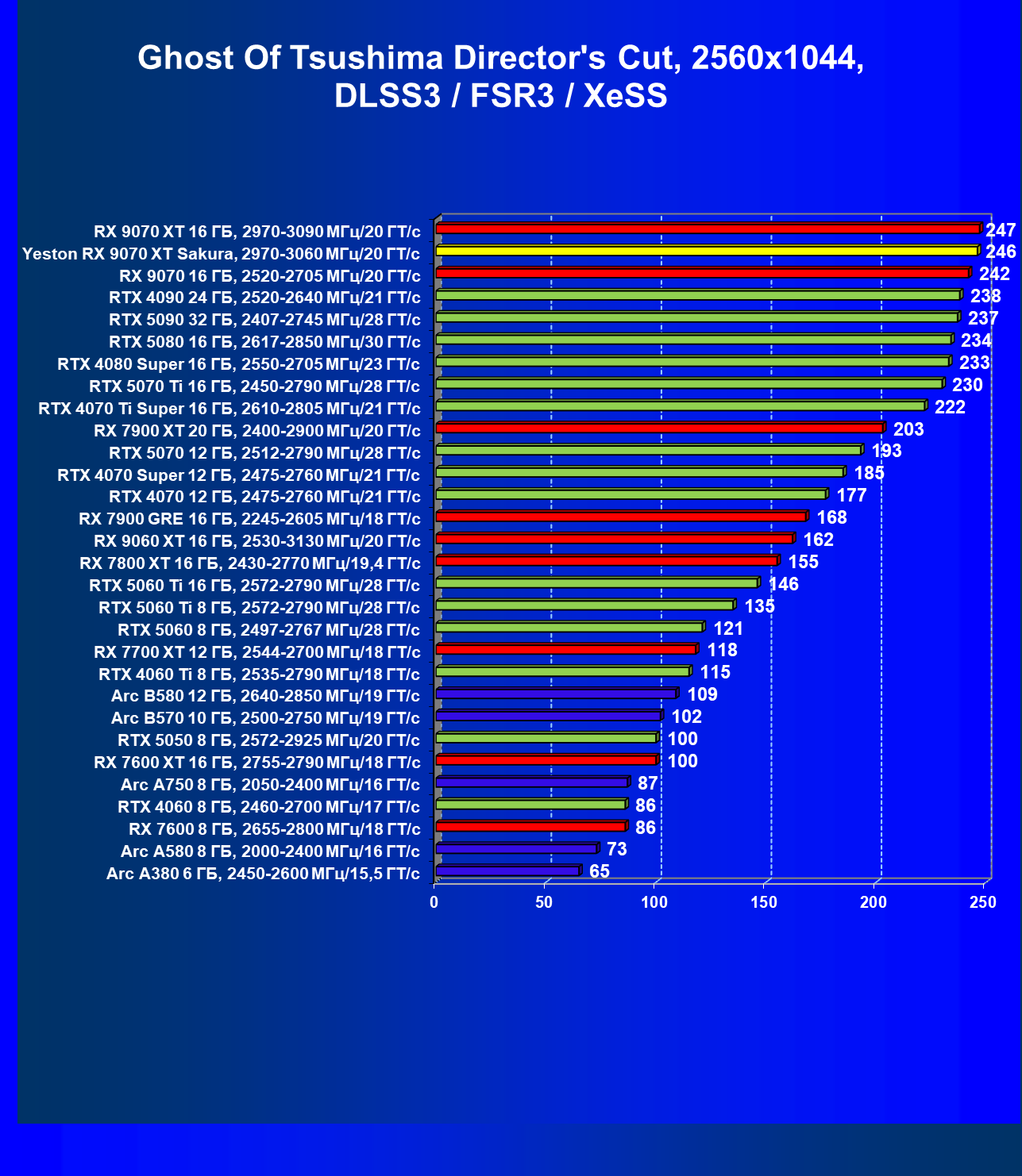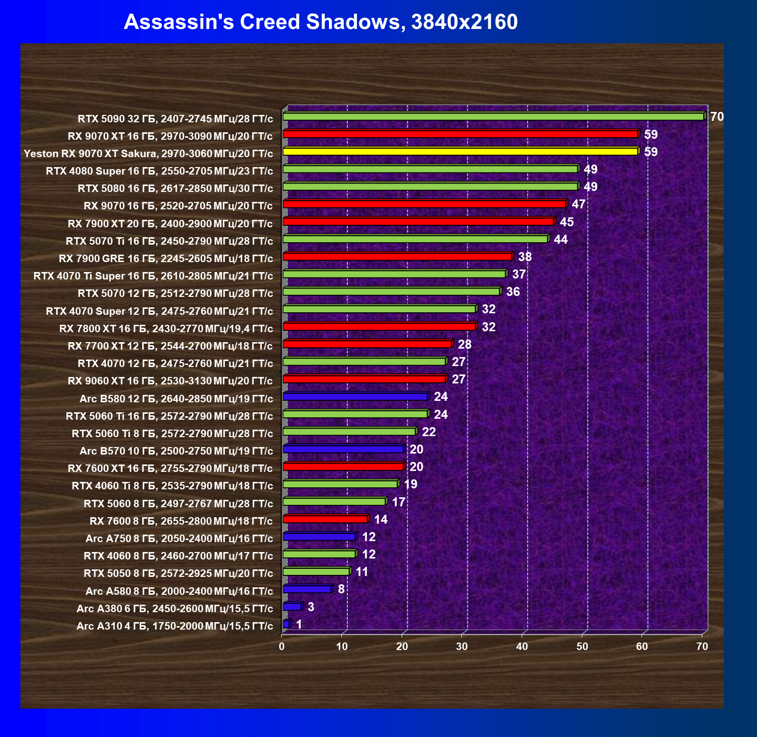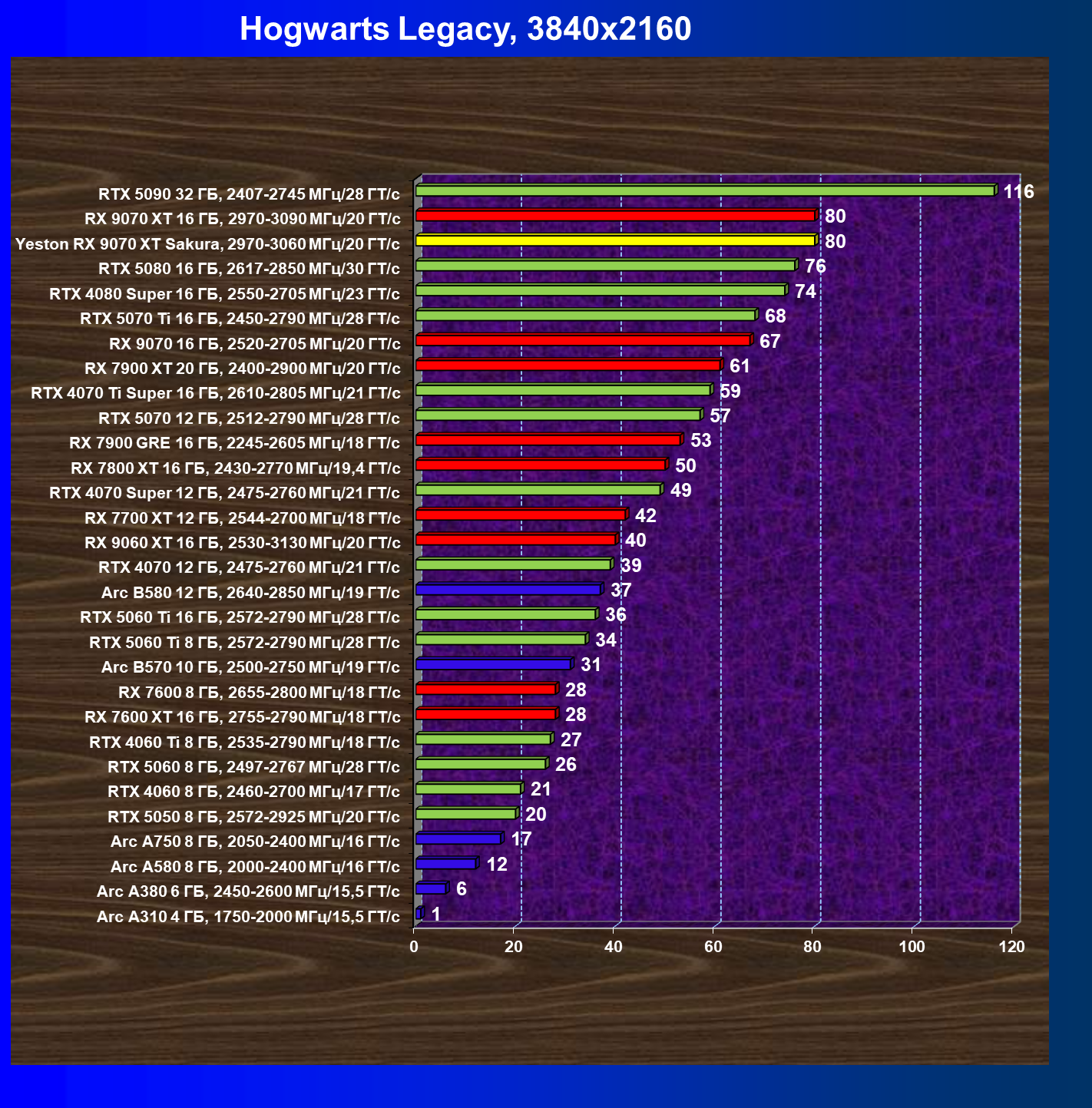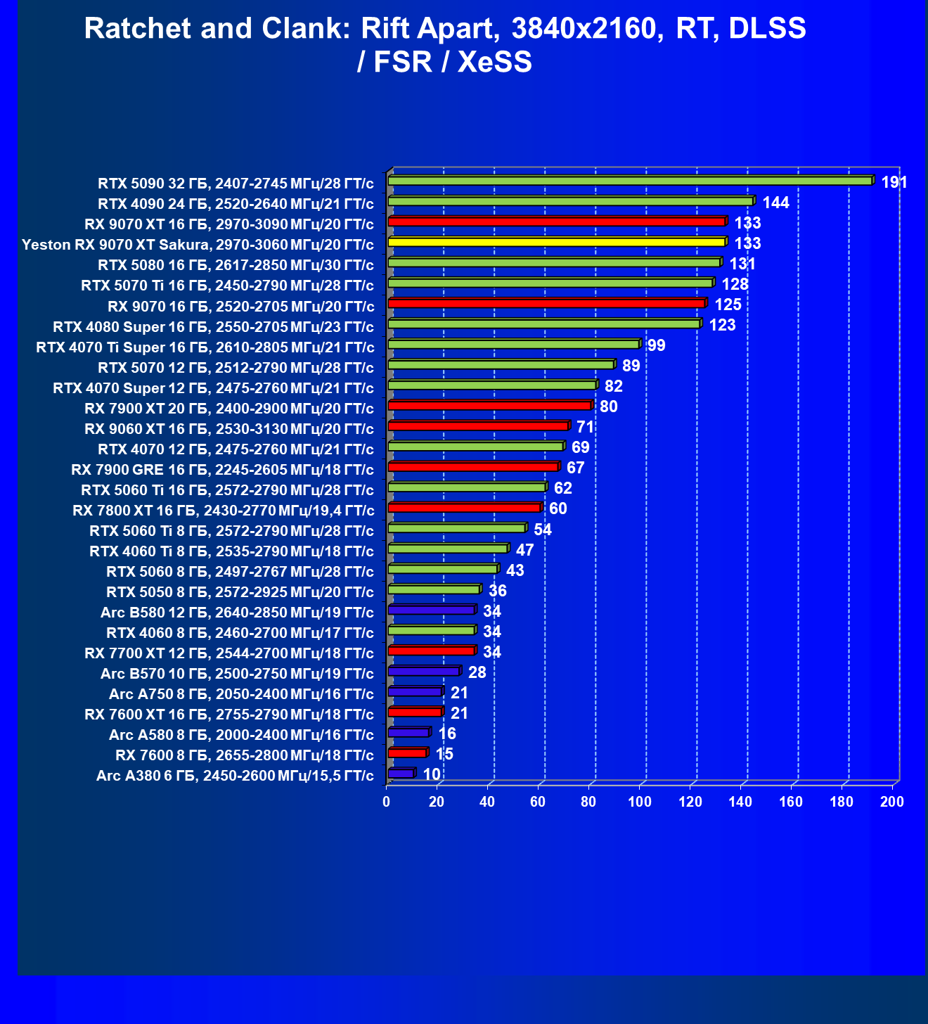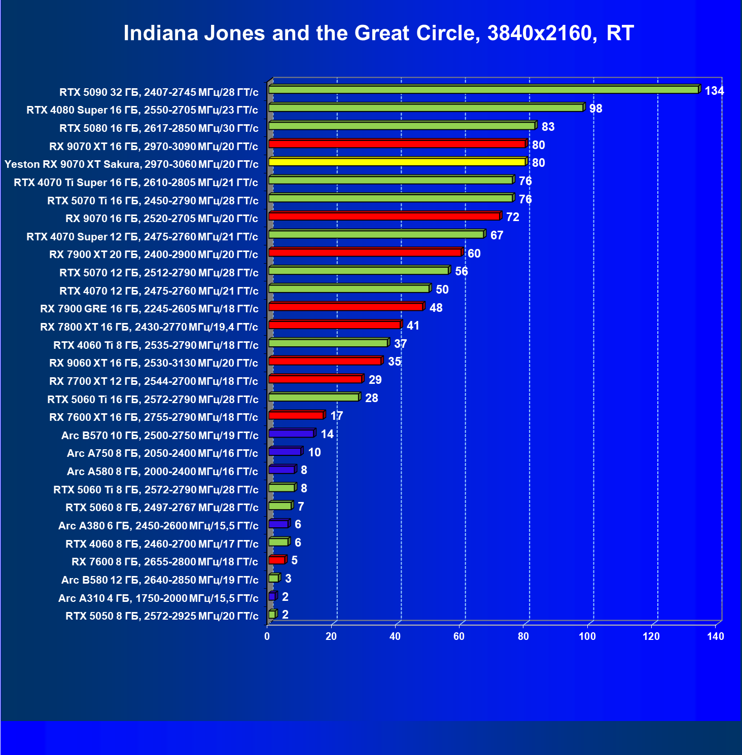 | 08 | Yeston RX 9070 XT Sakura, 2970—3060 МГц/20 ГТ/с | 312 | 2399 | 77 000 |