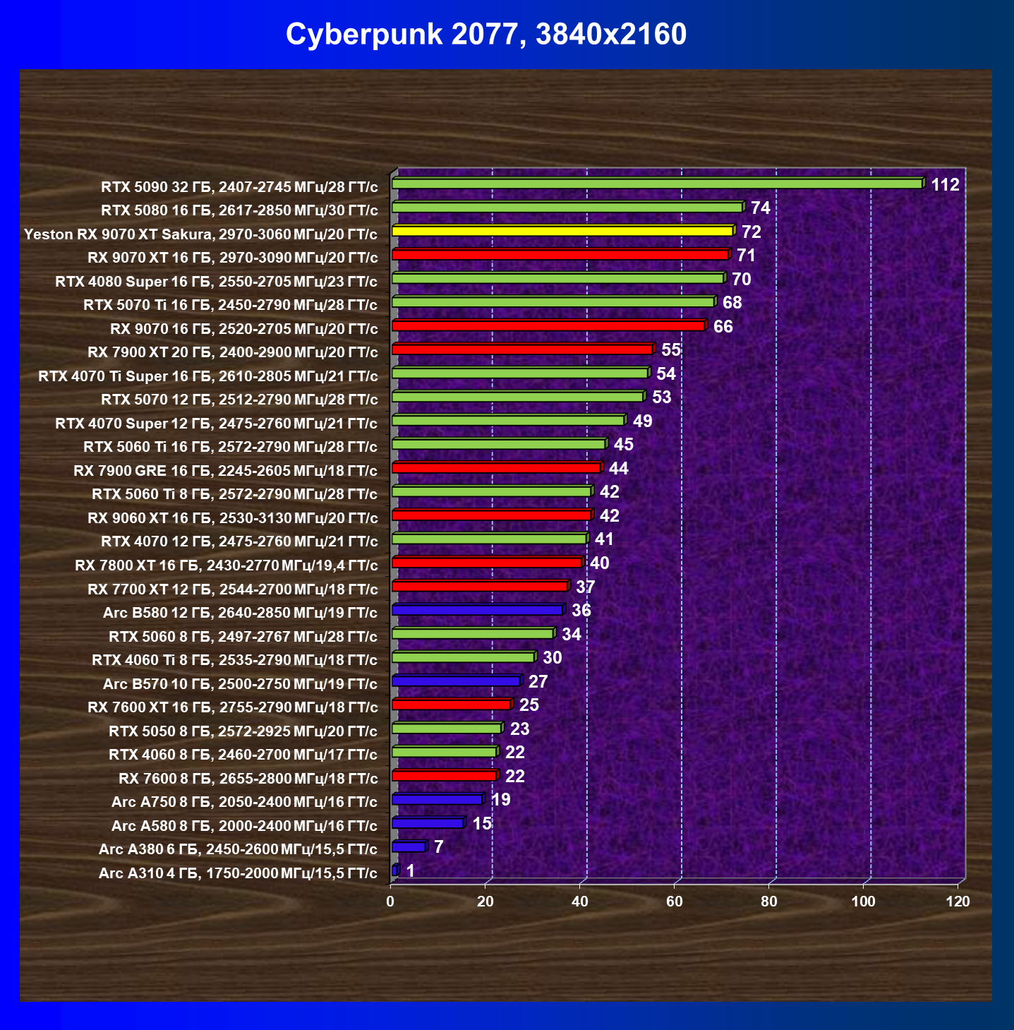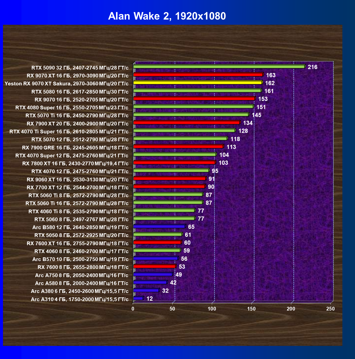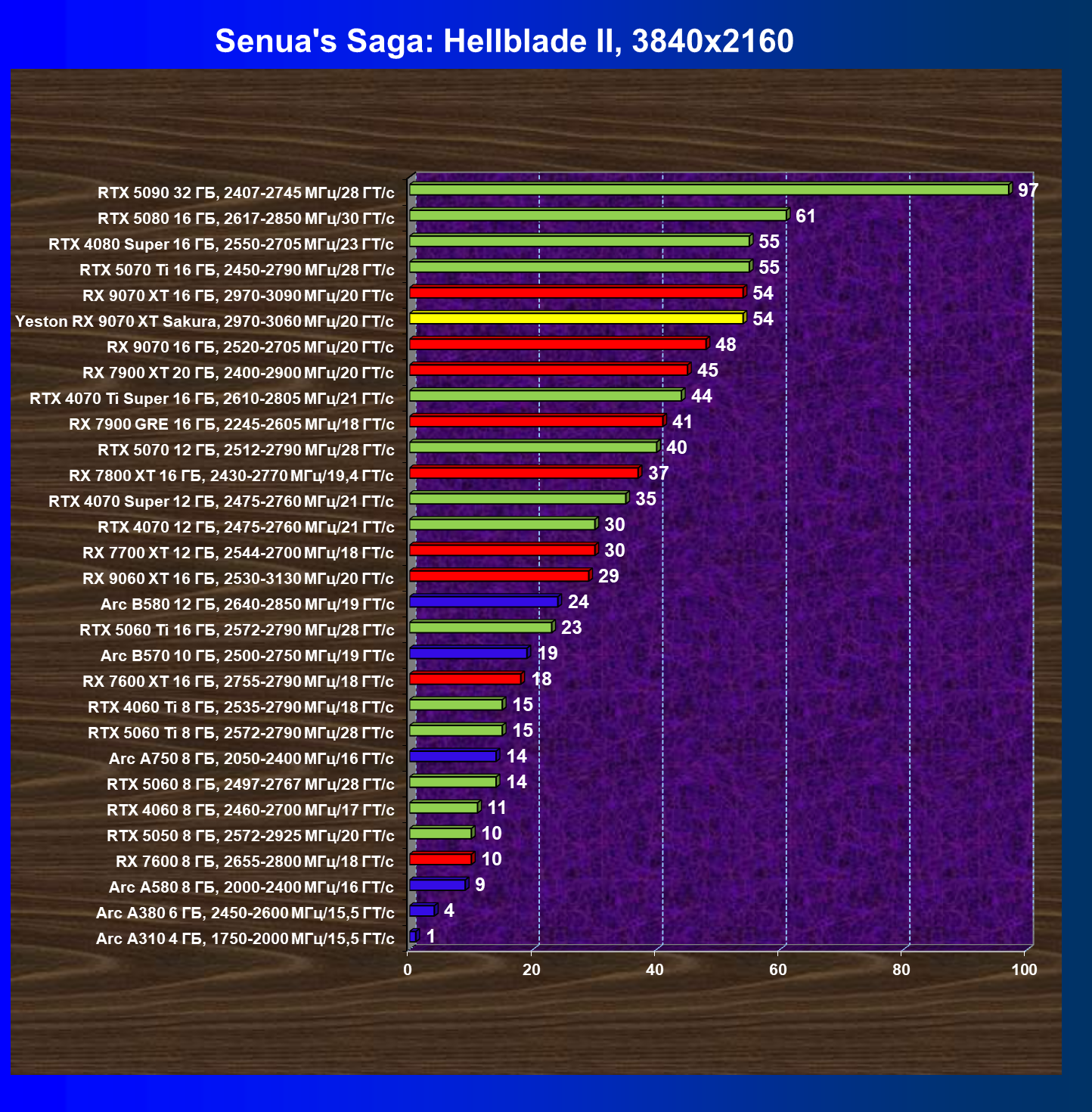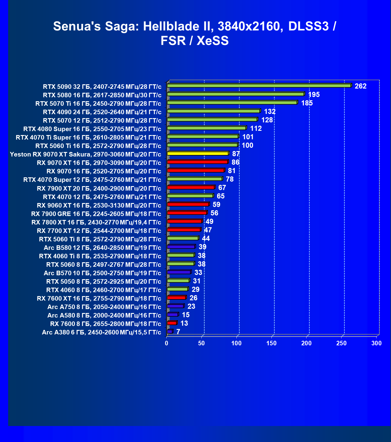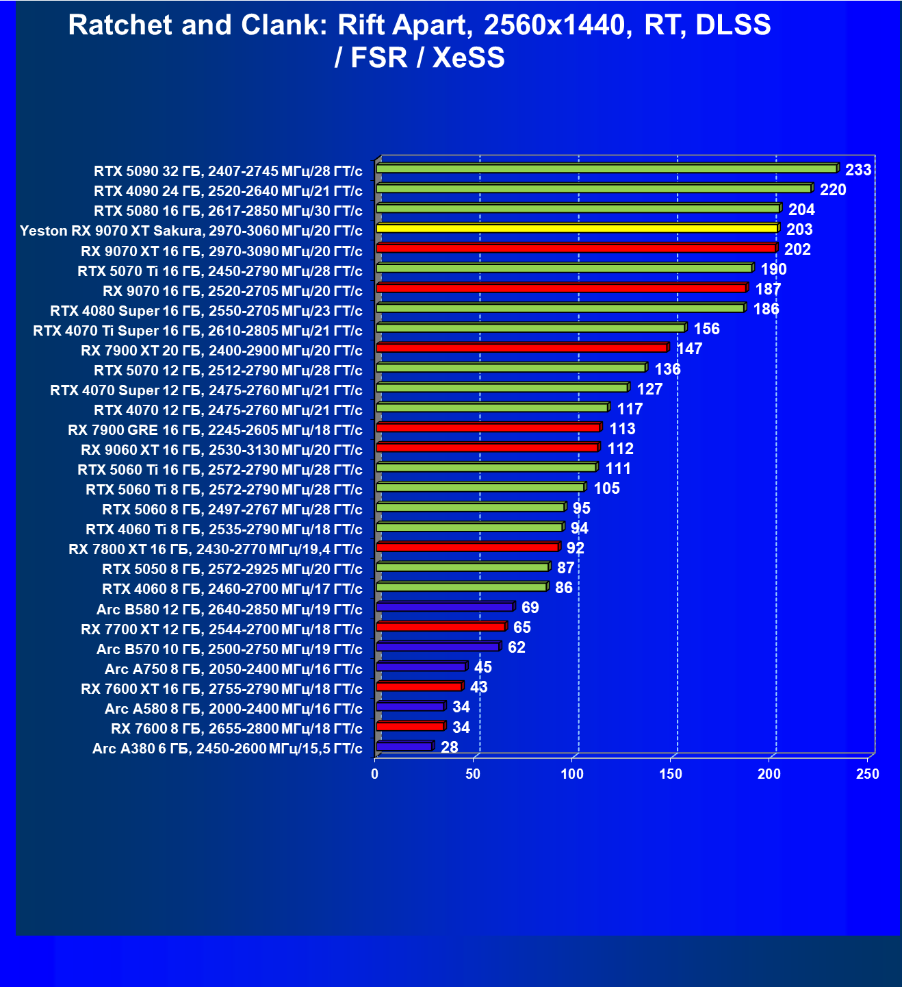| 08 | Yeston RX 9070 XT Sakura, 2970—3060 МГц/20 ГТ/с | 312 | 2399 | 77 000 |