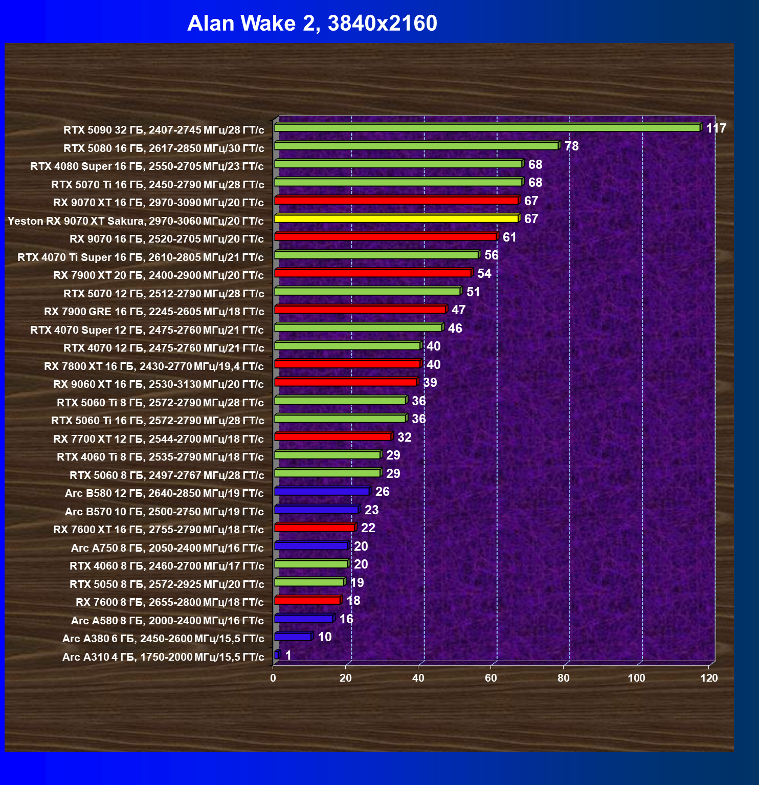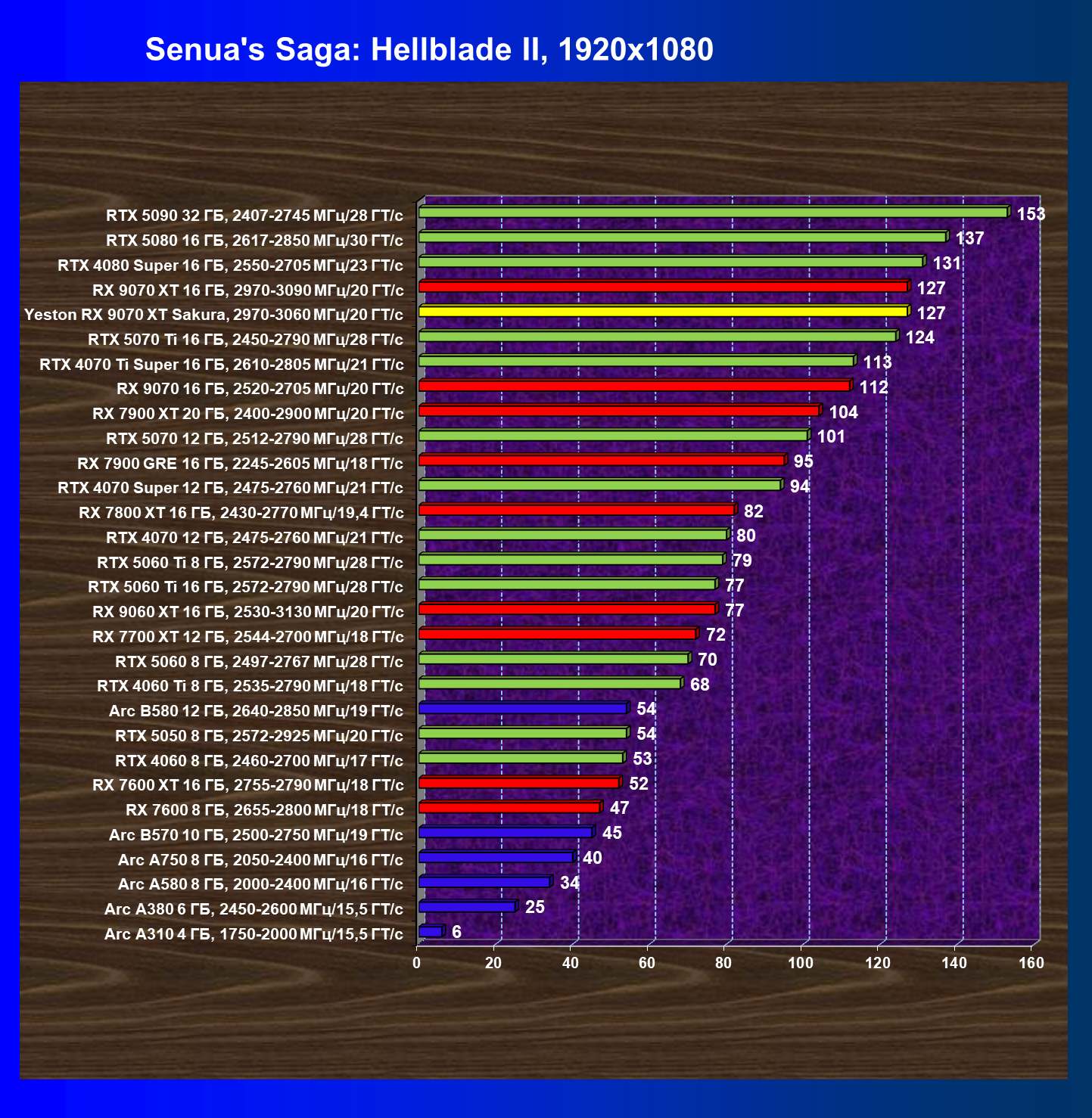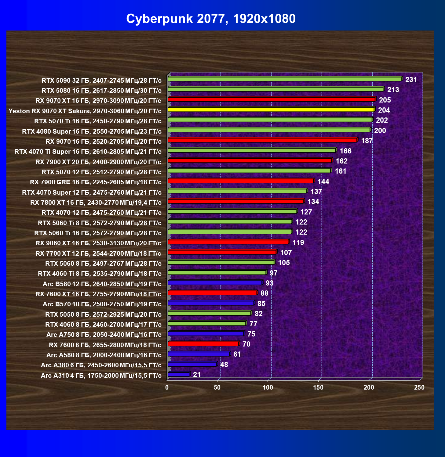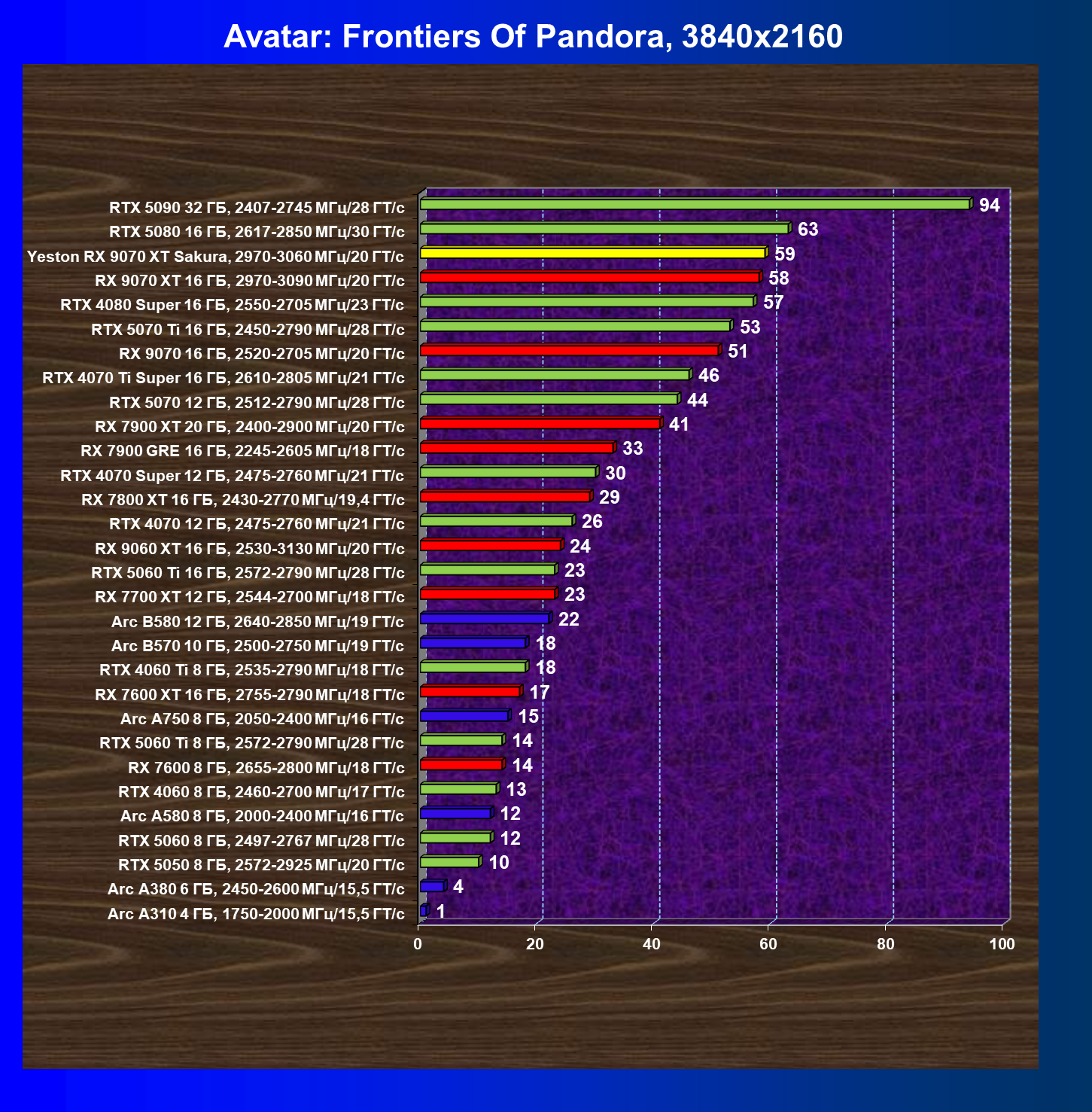 | 08 | Yeston RX 9070 XT Sakura, 2970—3060 МГц/20 ГТ/с | 312 | 2399 | 77 000 |