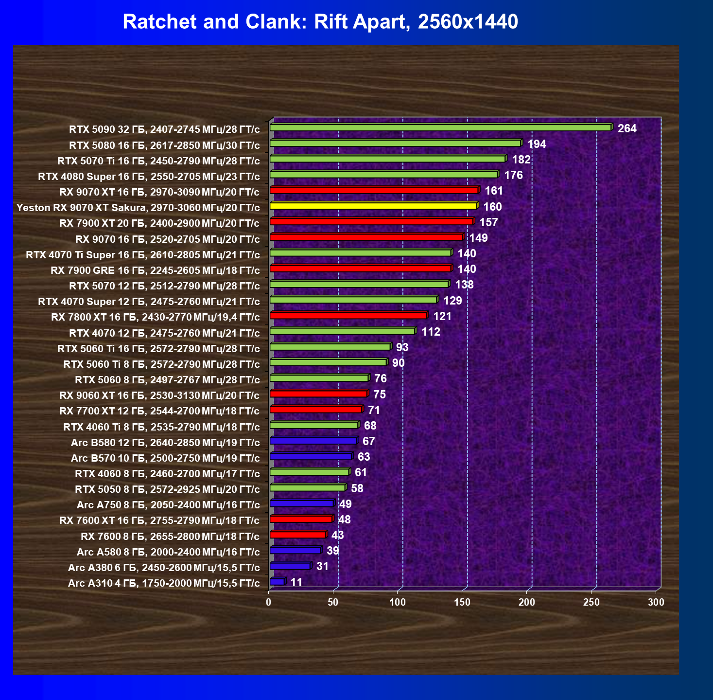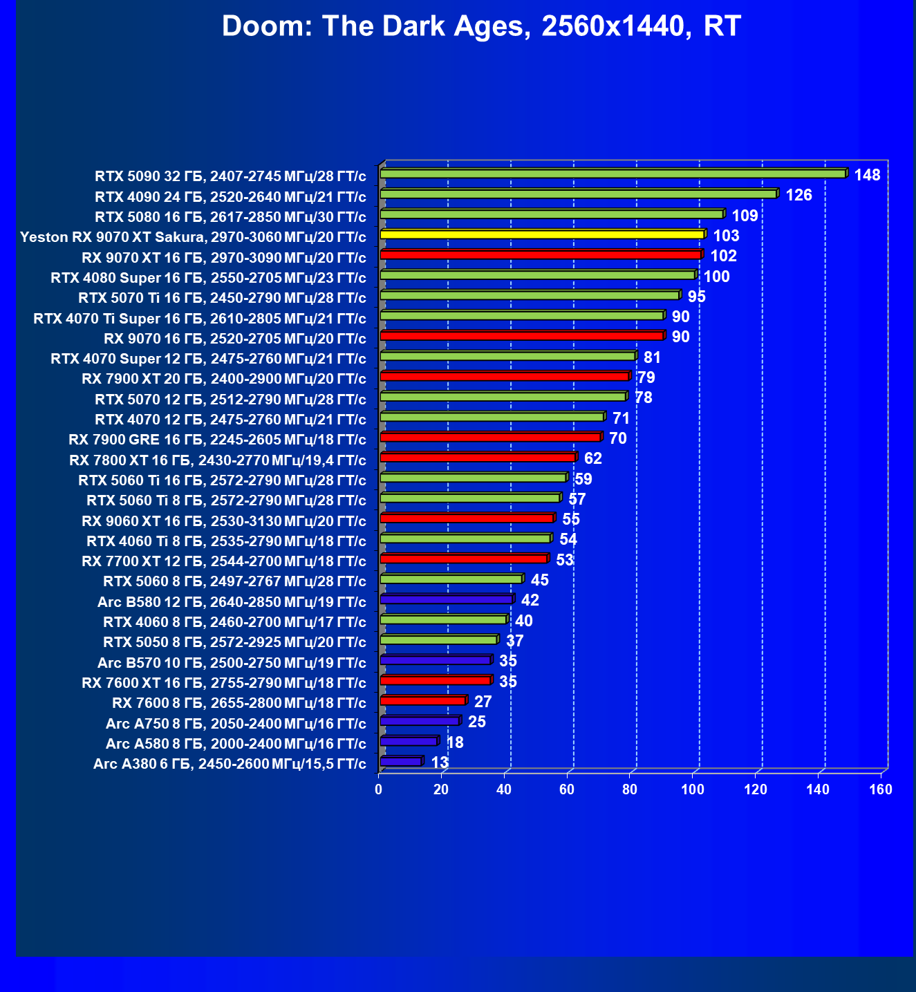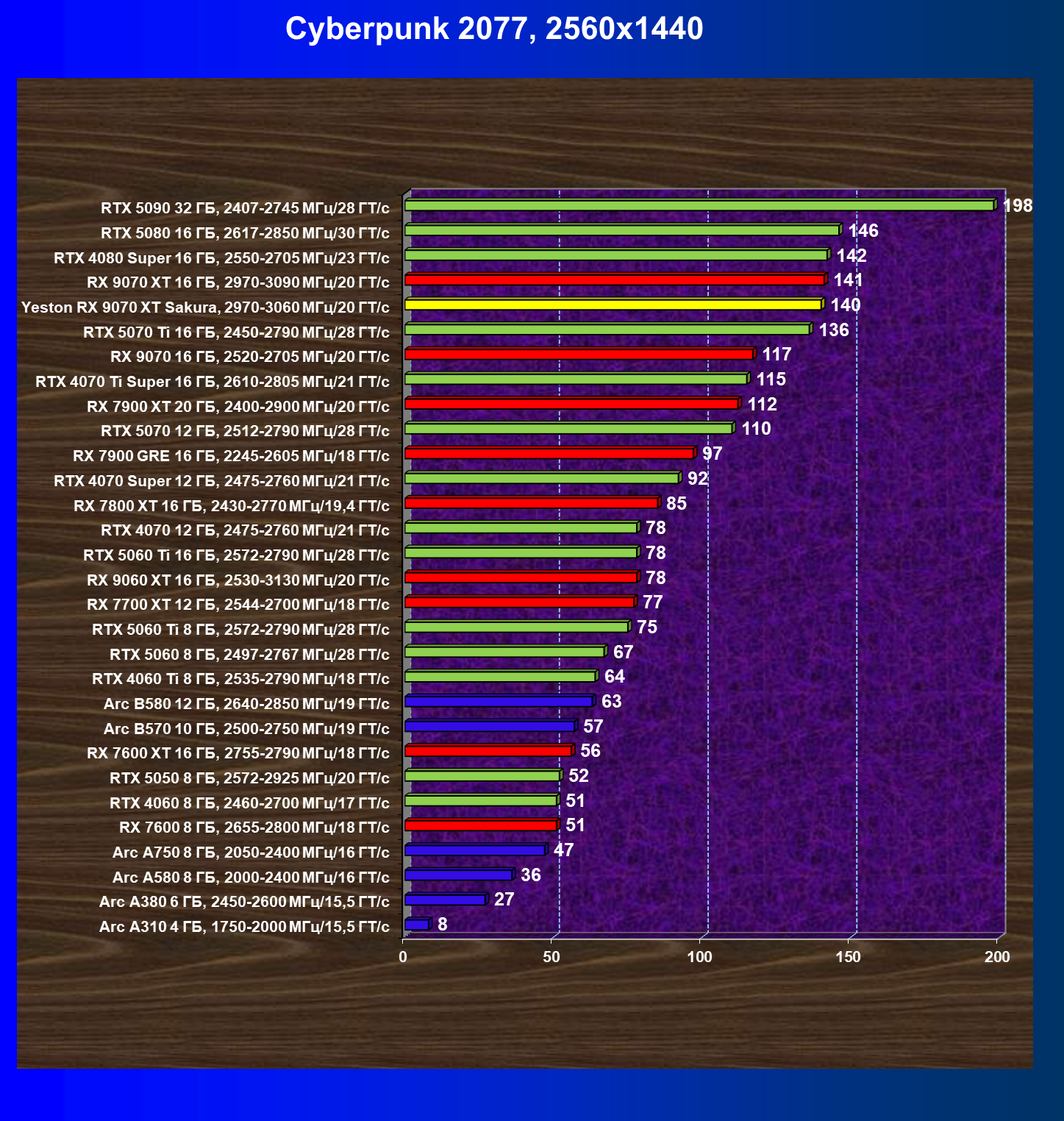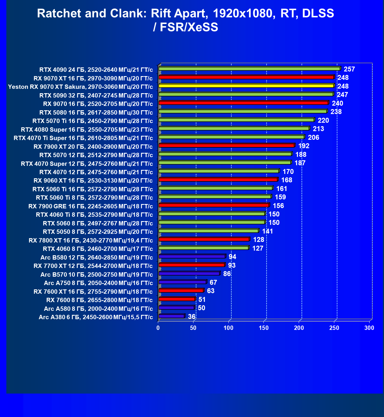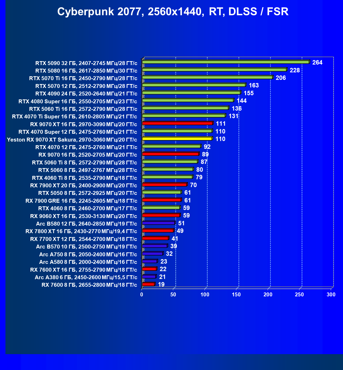 | 08 | Yeston RX 9070 XT Sakura, 2970—3060 МГц/20 ГТ/с | 312 | 2399 | 77 000 |