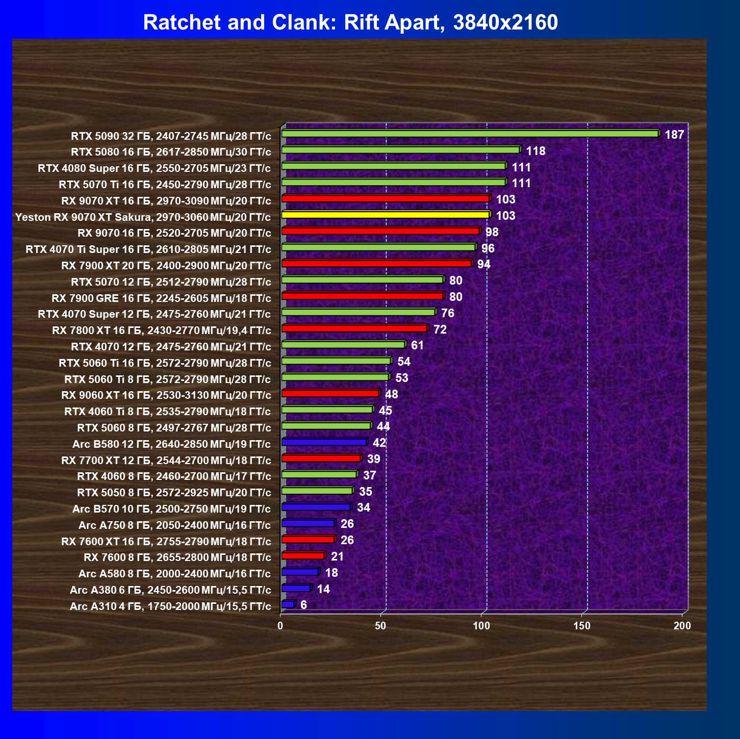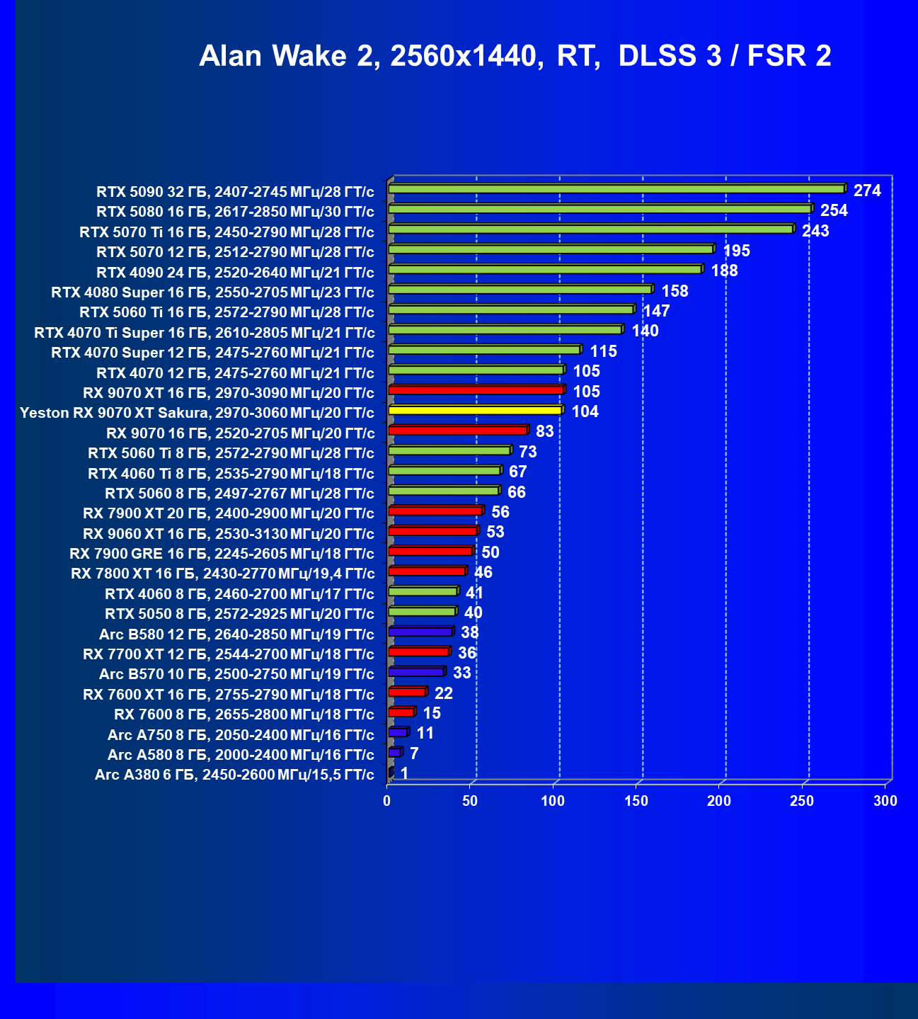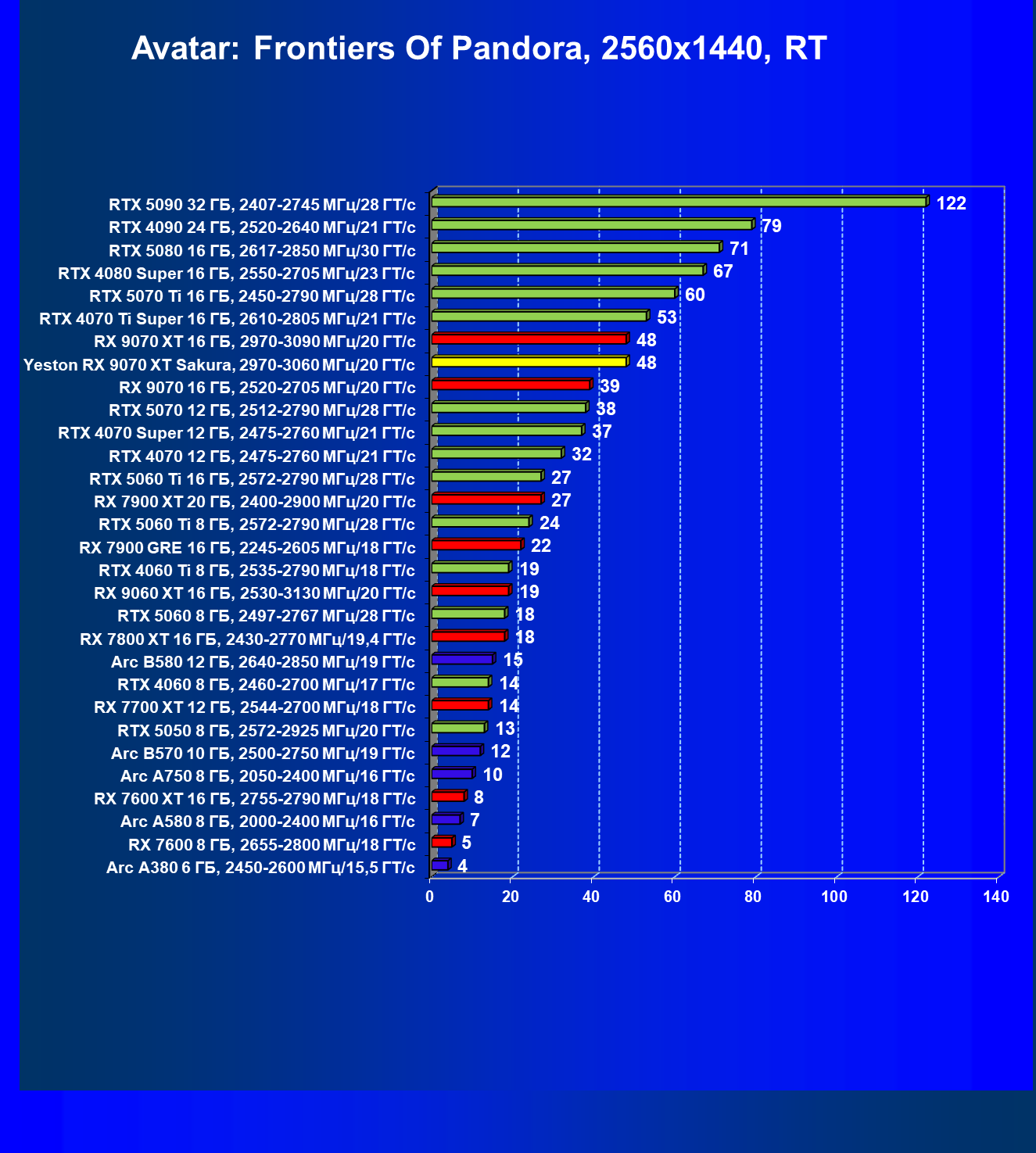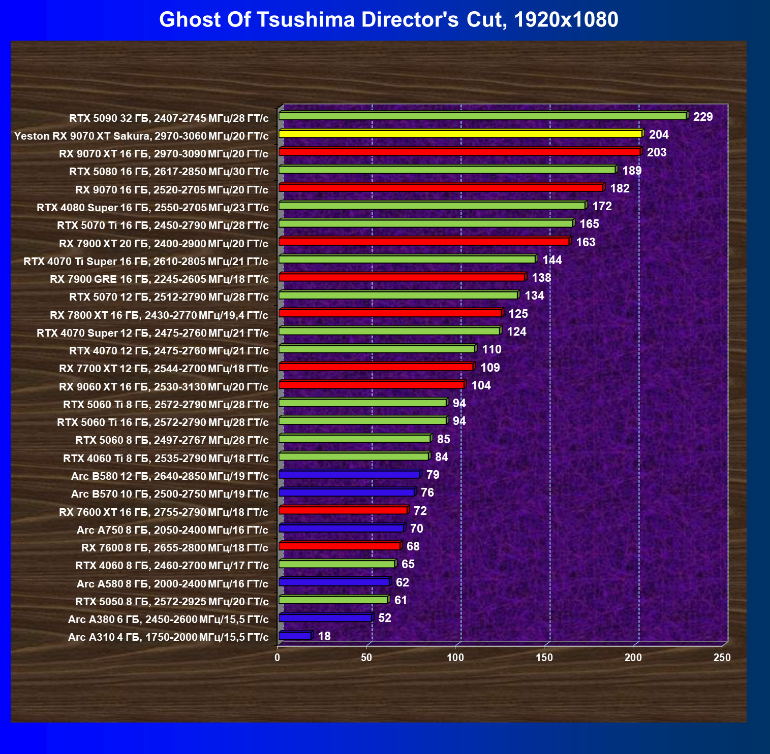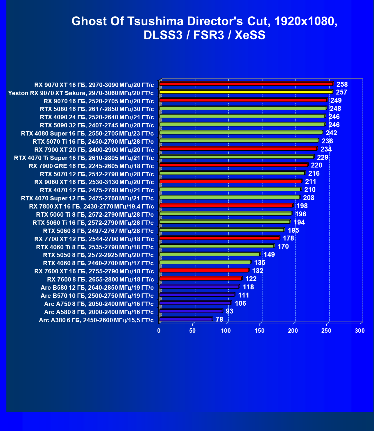 | 08 | Yeston RX 9070 XT Sakura, 2970—3060 МГц/20 ГТ/с | 312 | 2399 | 77 000 |