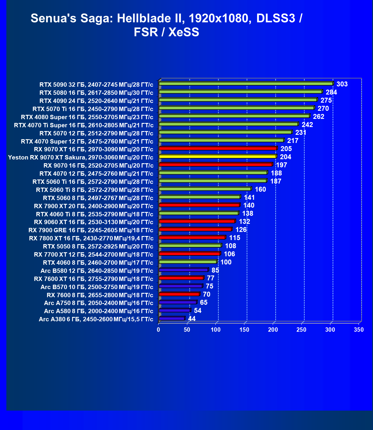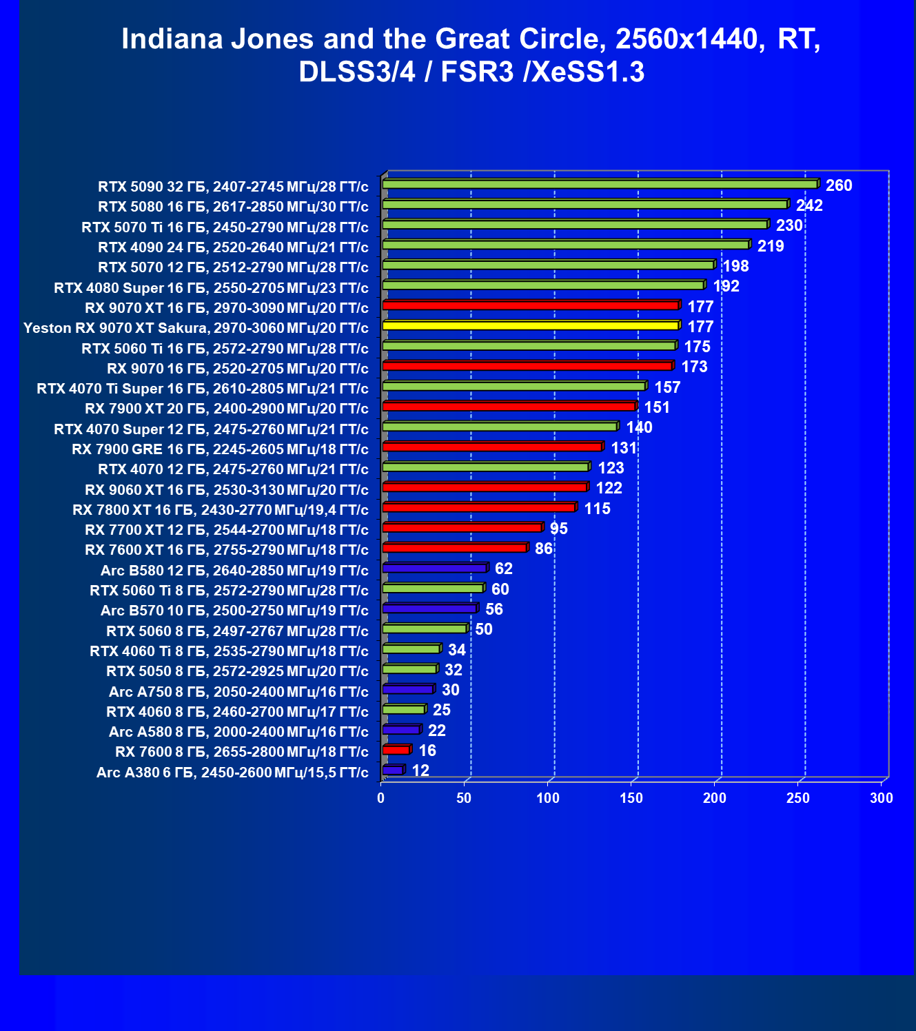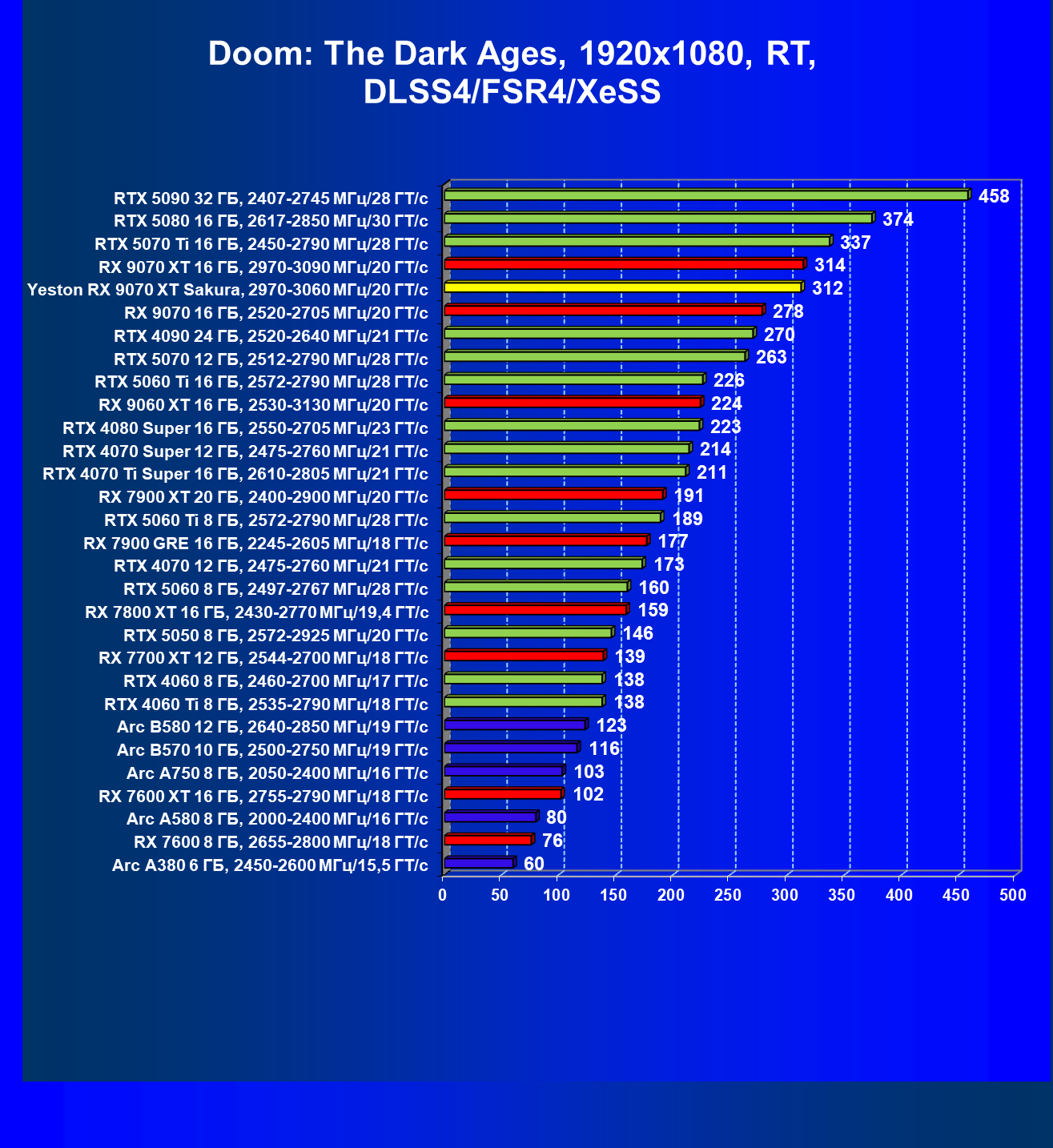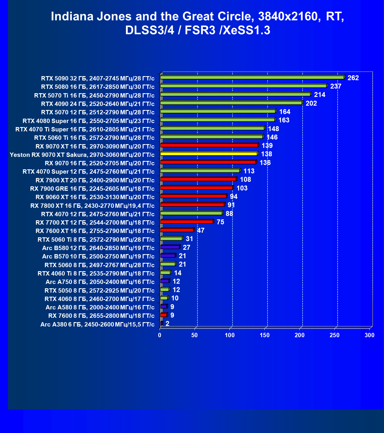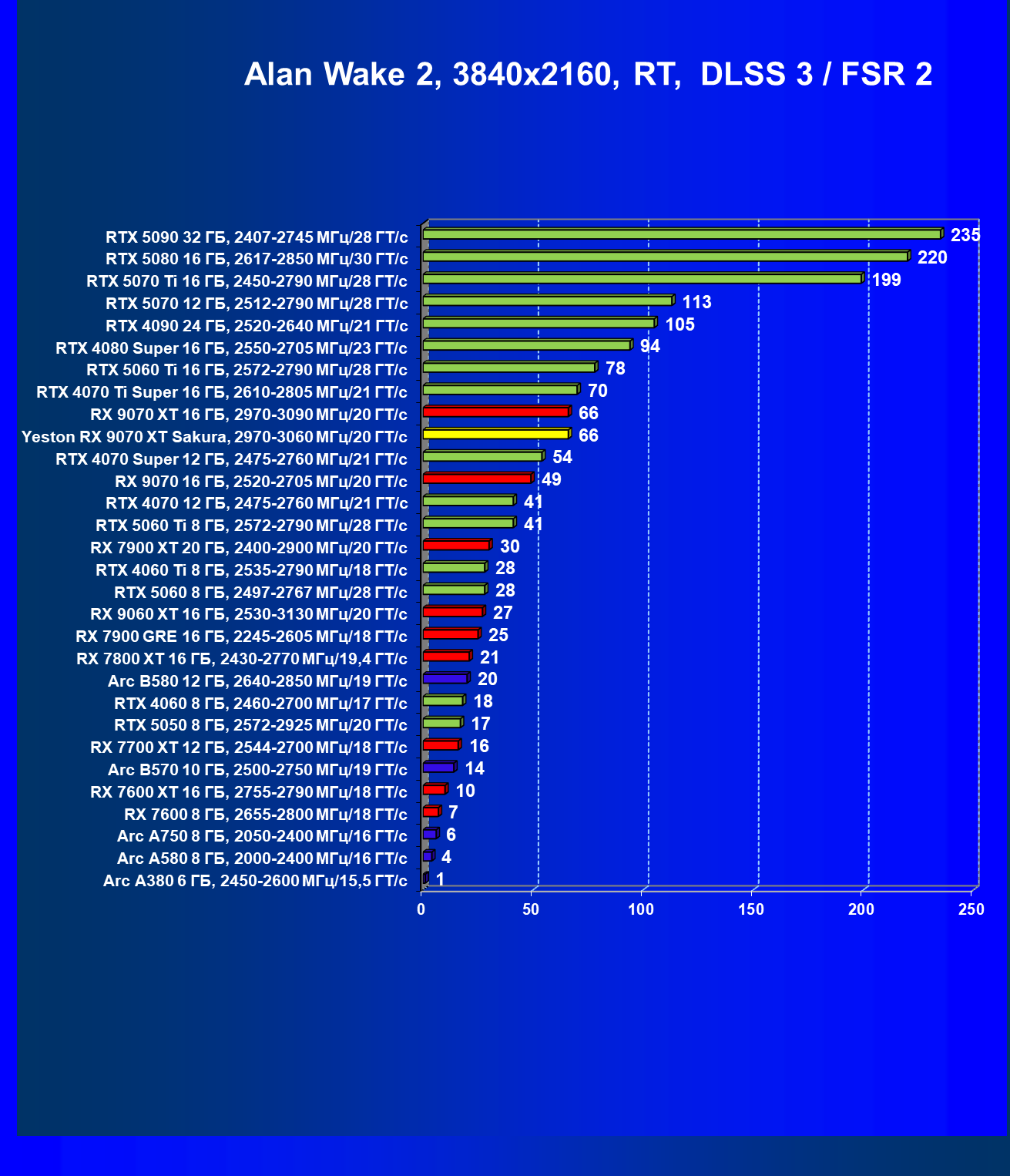 | 08 | Yeston RX 9070 XT Sakura, 2970—3060 МГц/20 ГТ/с | 312 | 2399 | 77 000 |