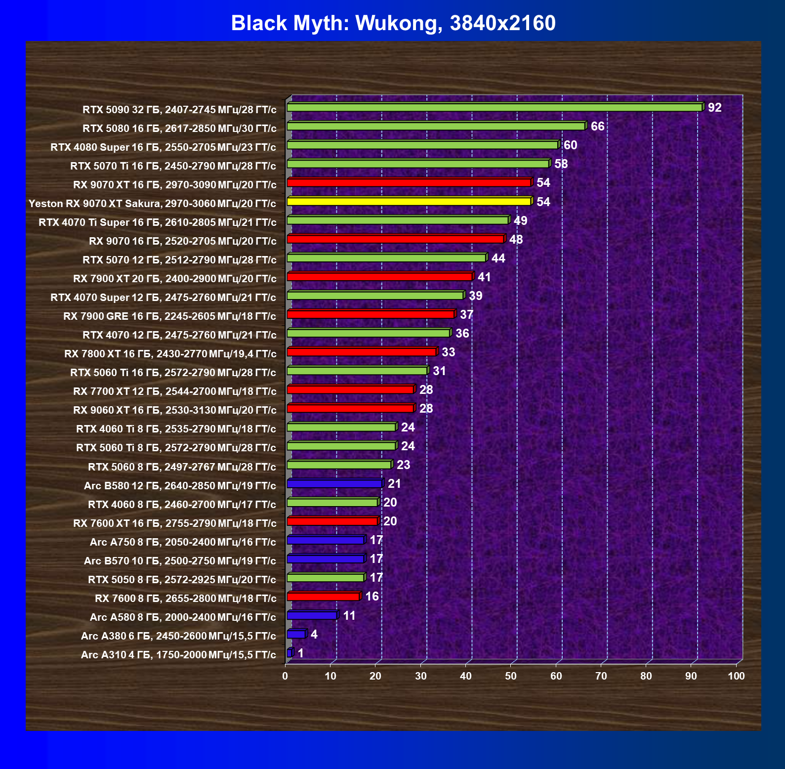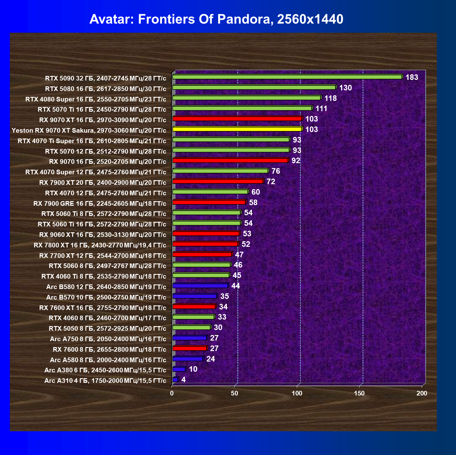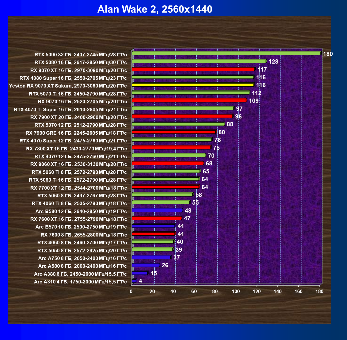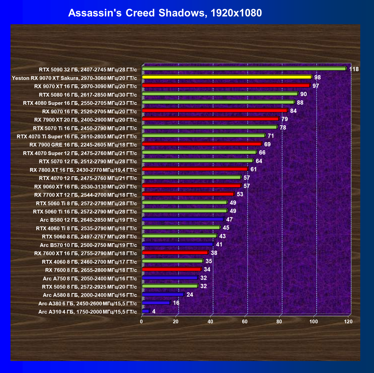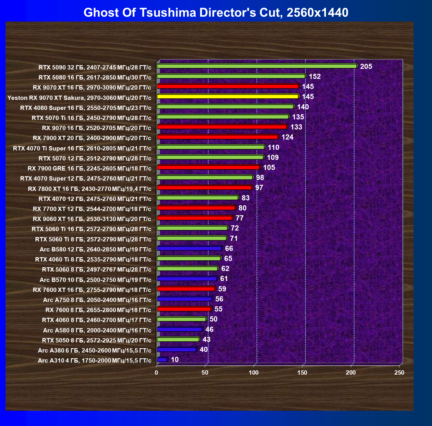 | 08 | Yeston RX 9070 XT Sakura, 2970—3060 МГц/20 ГТ/с | 312 | 2399 | 77 000 |