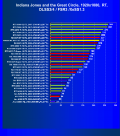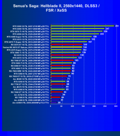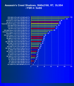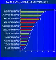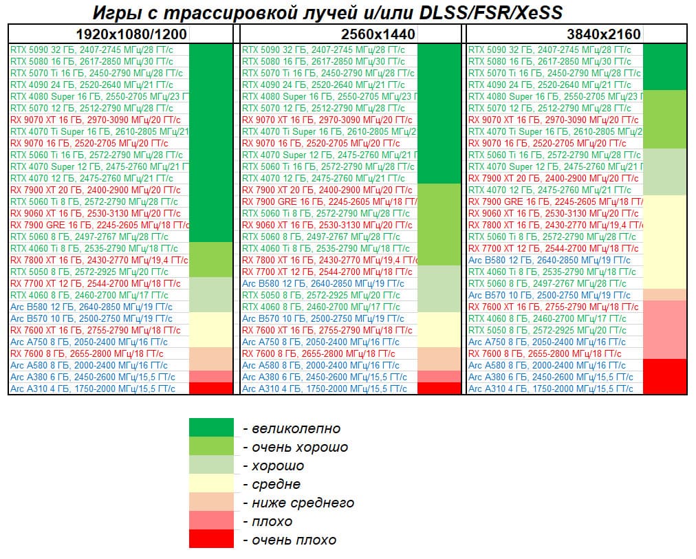 - Результаты тестов со включенной аппаратной трассировкой лучей и/или DLSS/FSR/XeSS в разрешениях 1920×1080, 2560×1440 и 3840×2160