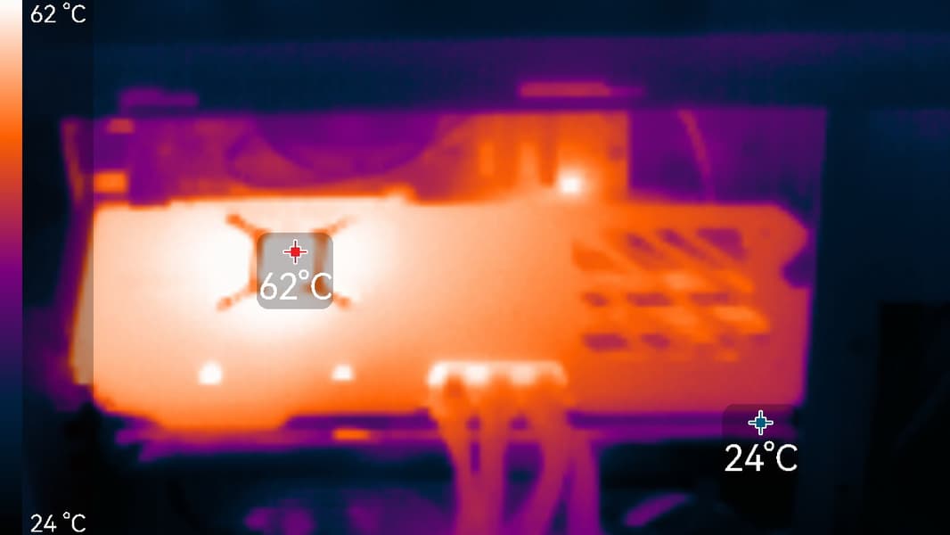 В режиме максимальной нагрузки в 3D температура достигала 62/91/85 °C (ядро/hot spot/память). Вентиляторы при этом раскручивались до 1970 оборотов в минуту, шум вырастал до 32,4 дБА: это также отчетливо слышно.